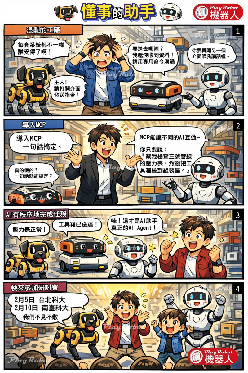 有了 MCP 的做法:一句話「幫我檢查三號管線的壓力表,然後把工具箱送到組裝區。」