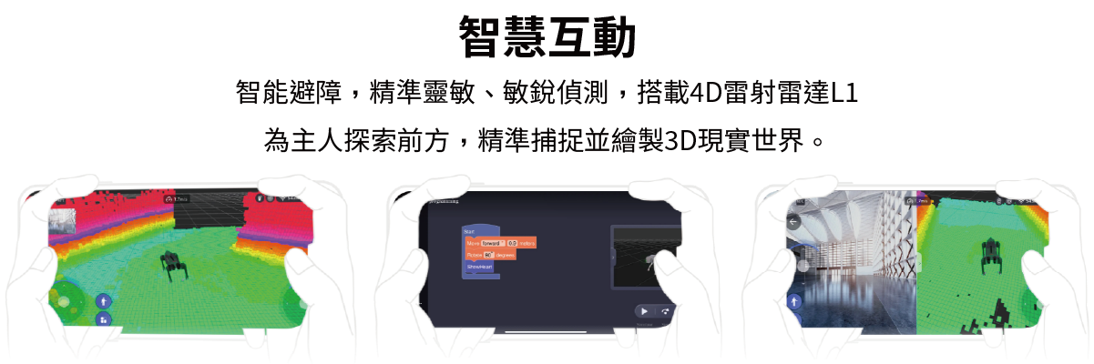 Go2搭載Unitree自主研發的4D雷射雷達L1,具有360°x90°半球超寬辨識、超小盲點、最小偵測距離低至0.05m,使Go2實現全地形辨識。