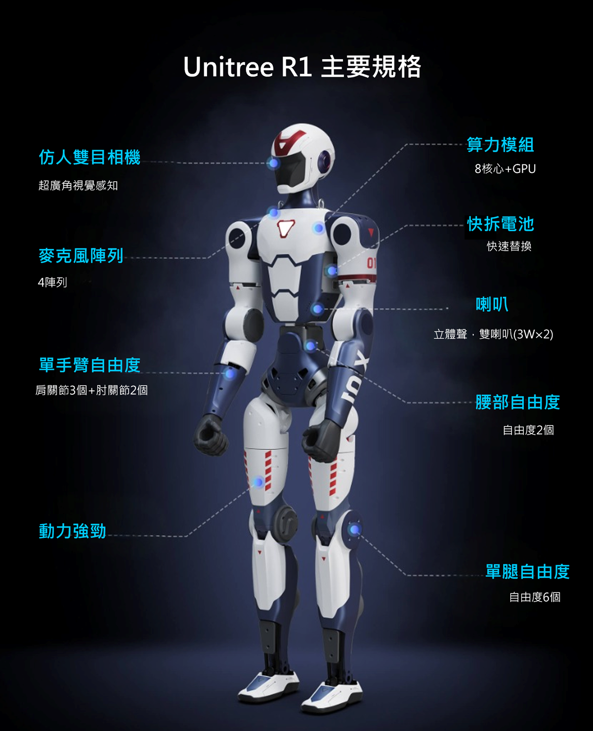 Unitree R1 是一款優秀的 人形機器人,具備高度擬人化的外型與動作能力。