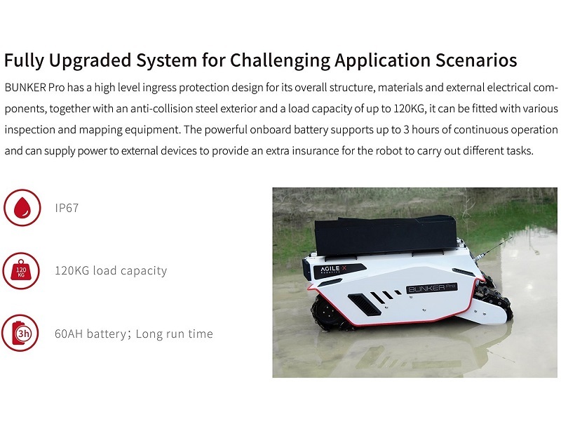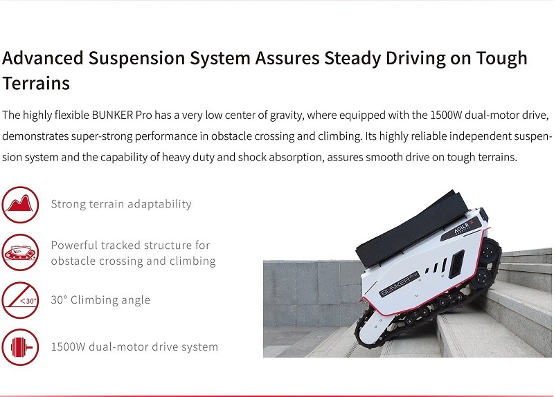 BUNKER PRO 具有超高的越野機動性,可輕鬆應對軟土、陡坡、水坑、箱涵等挑戰性環境。