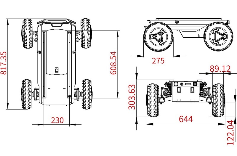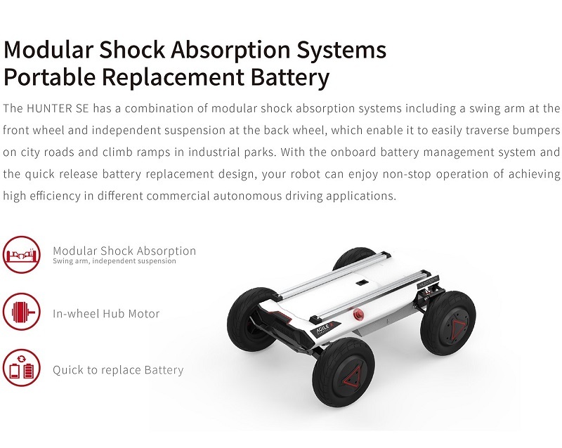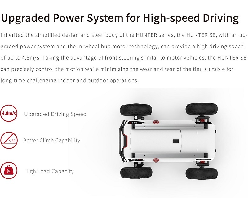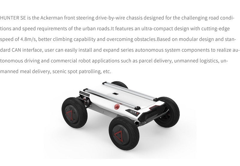 HUNTER SE 是阿克曼轉向線控移動機器人底盤,車身更小,具有以下獨特的優勢: