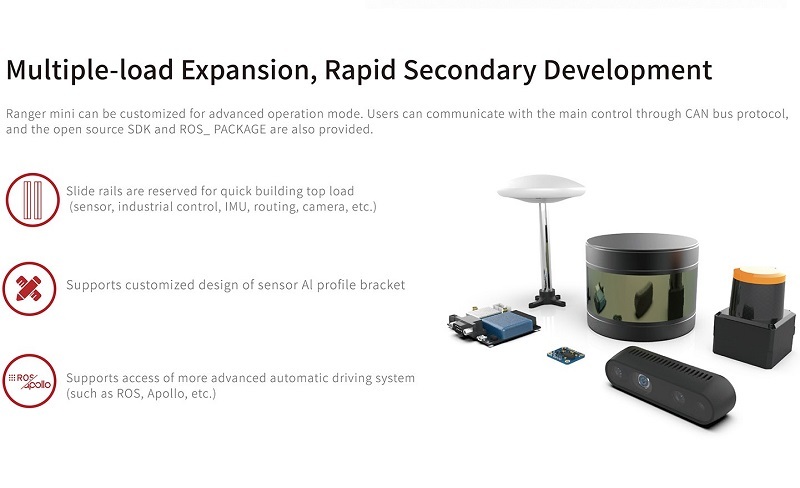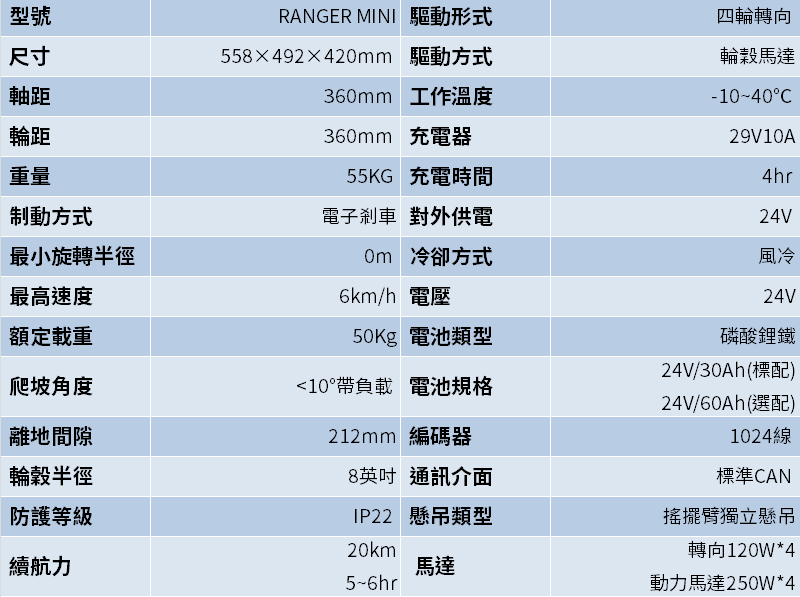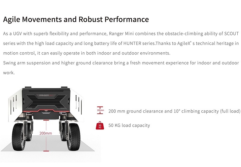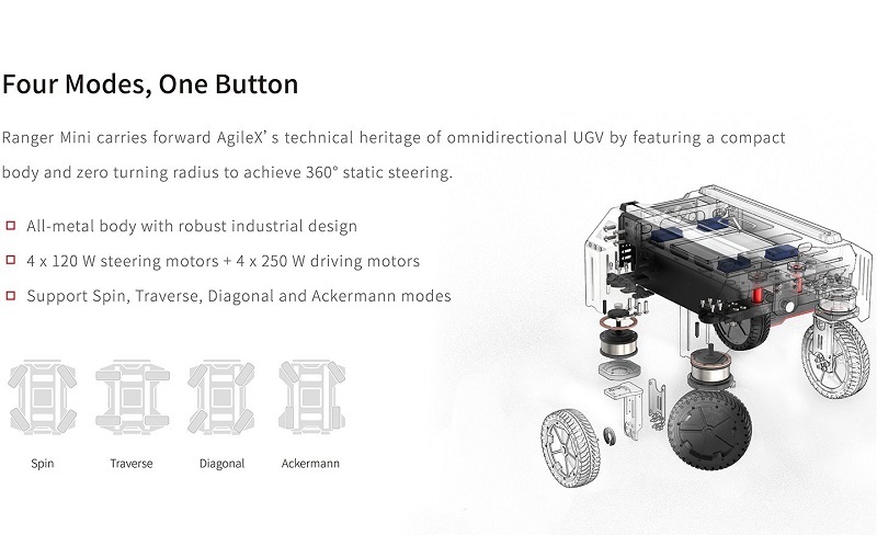 Ranger Mini 為全新型態的全向型UGV,基於全新的四輪四轉運動控制理論,採用驅動與轉向一體化的獨立驅動模組設計,具備多種靈活運動模式。
