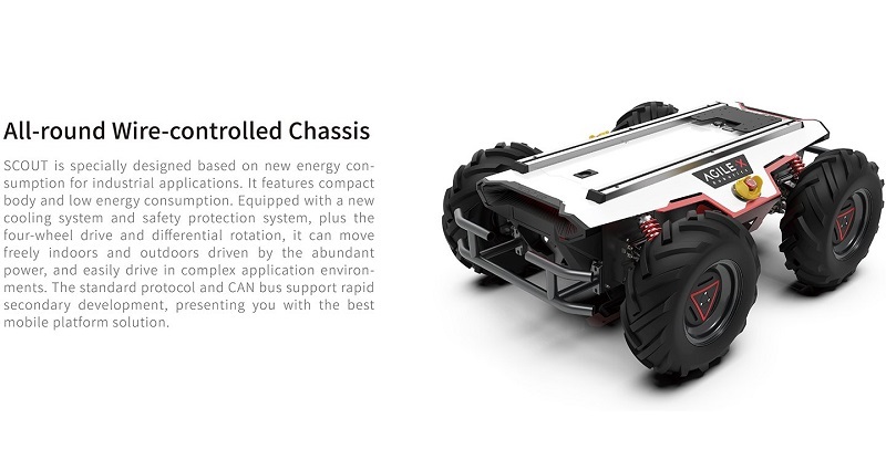 SCOUT 2.0基於全新低耗能設計,專為行業應用而生。機身緊湊小巧,低功耗,內建全新散熱系統及安全防護系統,室內戶外來去自如,四輪驅動,差速自轉,動力充沛,輕鬆駕馭複雜應用環境,標準協定及CANbus支持快速二次開發,為您呈現最佳移動平台解決方案。