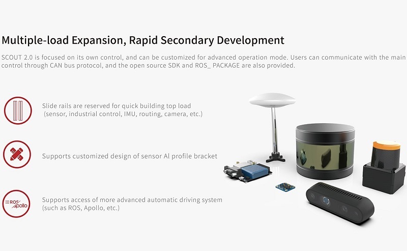 SCOUT 2.0 能搭配自動駕駛解決方案(如:R&D Kit、Autopilot Kit、AUTO KIT)。 用戶可以通過CAN總線協議與控制器進行通訊,並且提供了SDK和ROS_PACKAGE。