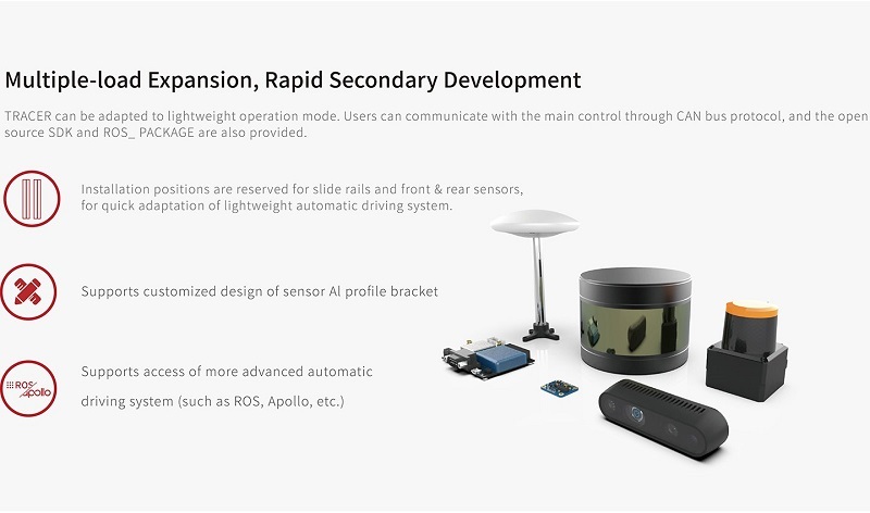 TRACER 可以適應輕量級的操作模式。 用戶可以通過CAN總線協議與控制器進行通訊,並且提供了SDK和ROS_PACKAGE。