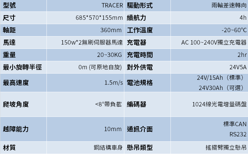 TRACER是一款兩輪差速AGV,適用於室內運輸,具有以下獨特的優勢: