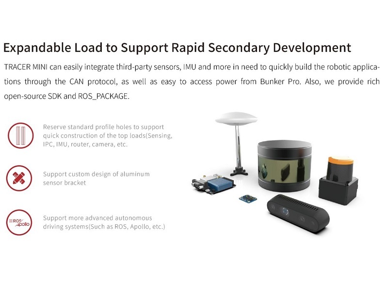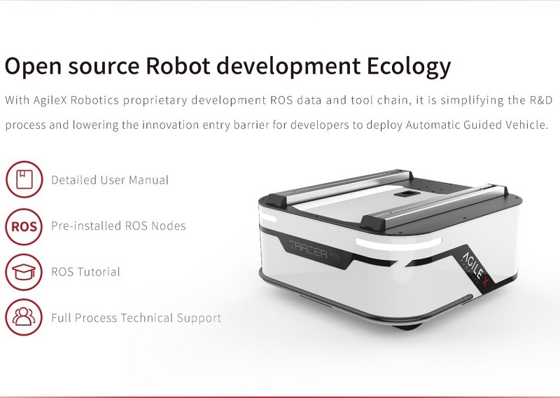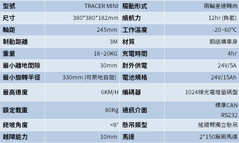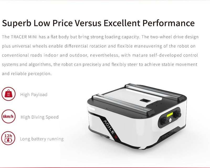TRACER MINI是一款高CP值的高速AGV,適用於室內運輸,設計旨在讓更多研究單位與學校能夠更快搭建穩定的開發實驗平台,實現ROS機器人研究教學、室內無人運輸和服務機器人等研究、專案開發。