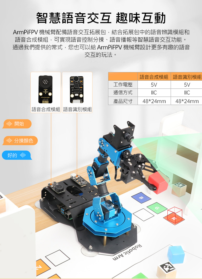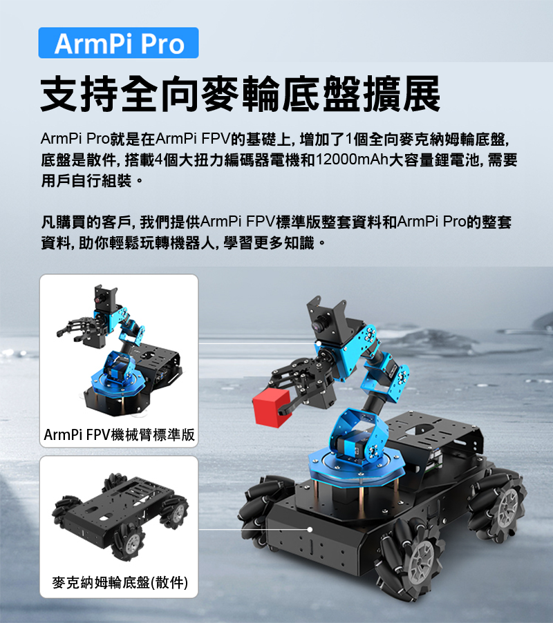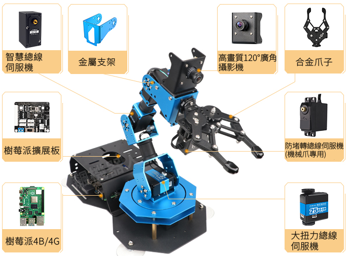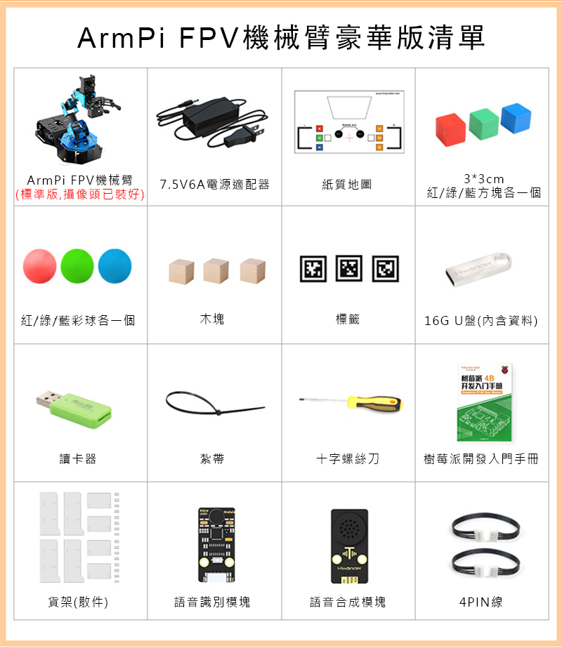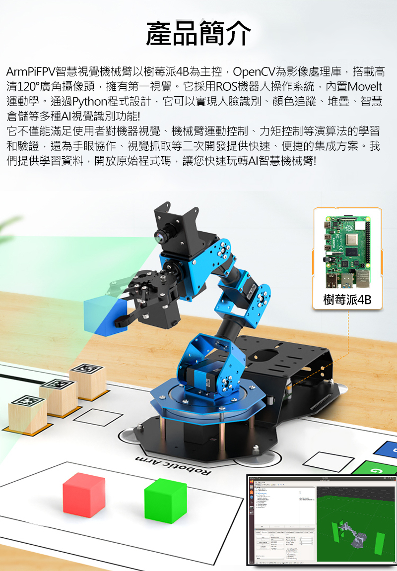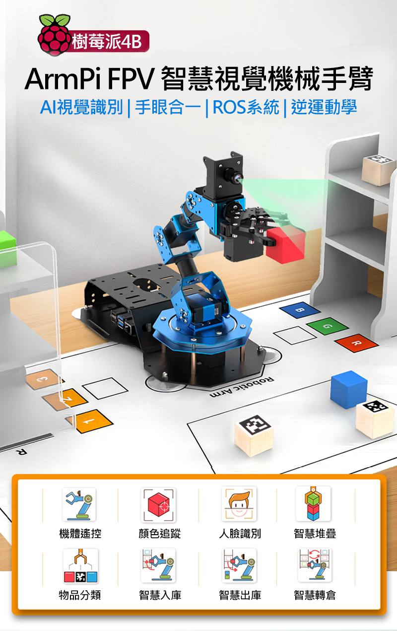 ArmPi-FPV樹莓派AI ROS機械手臂,由樹莓派4B作為主控,OpenCV為影像處理,搭載120度高畫質廣角鏡頭,透過Python編程,擁有視覺識別,AI視覺識別、手眼合一、ROS系統等多種視覺辨識功能。是你玩轉AI智慧手臂的好夥伴!