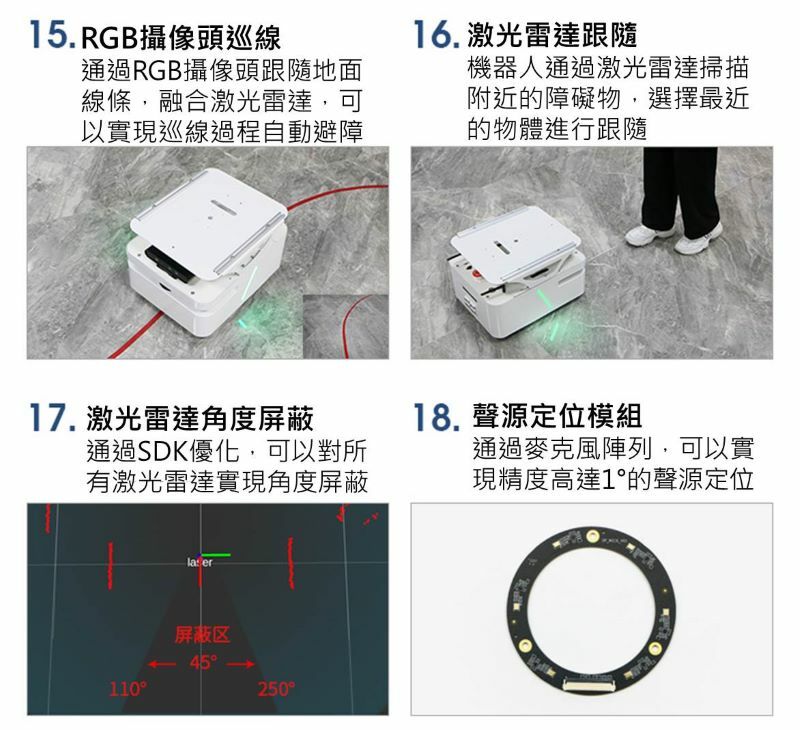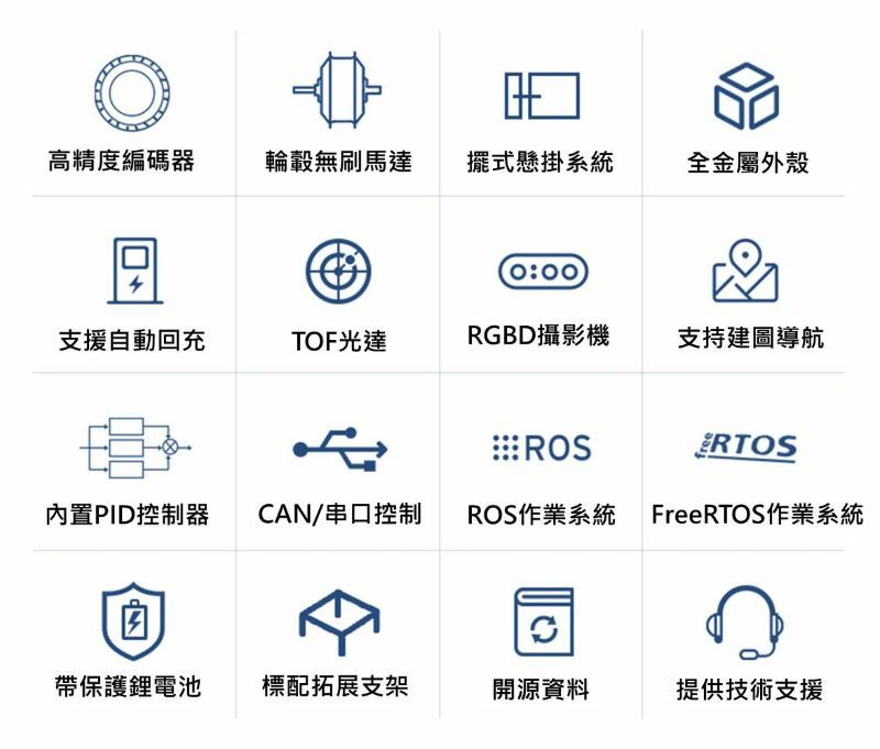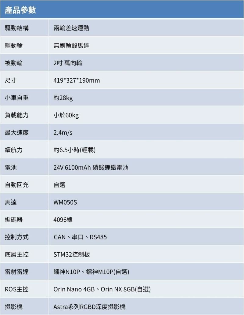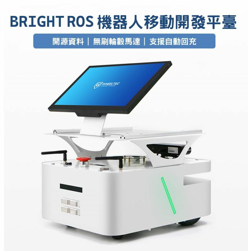 BRIGHT ROS 機器人是室內場景下的開源差速服務機器人產品,搭載高品質無刷輪毂馬達,靜音且動力充沛。並採用全新的外觀結構設計,支援選配自動回充功能,配備了鐳神TOF光達以及奧比中光Astra系列深度攝影機,ROS主控可選擇的Orin Nano/Orin NX方案,程式碼全開源。