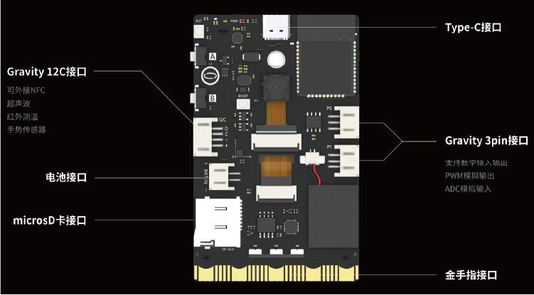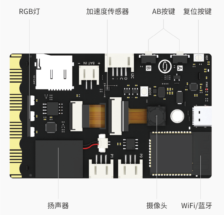 它集相機、LCD彩色螢幕、麥克風、揚聲器、WiFi藍牙模組、RGB指示燈及多種感測器和擴充介面於一體,