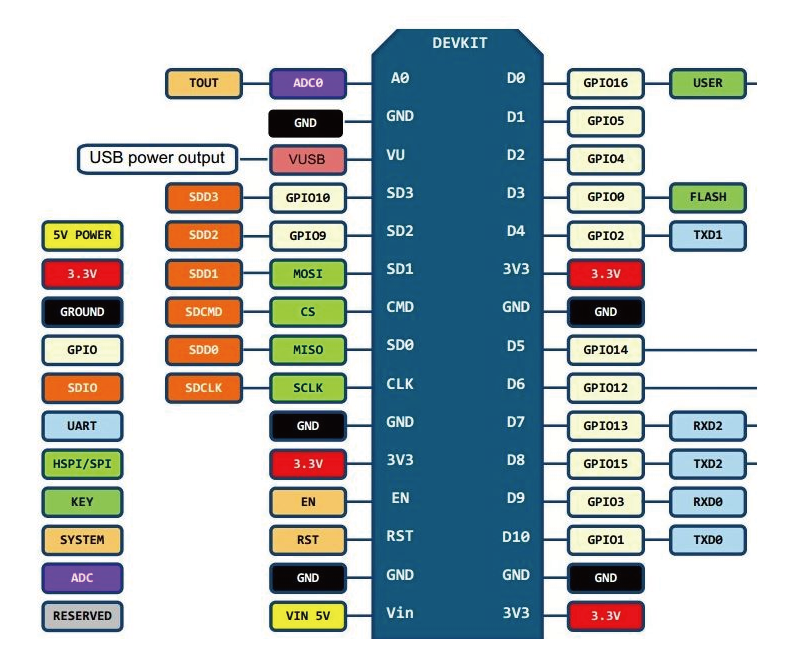 ● D0~D8、SD1~SD3:用作GPIO、PWM、IIC等,連接埠驅動能力15mA