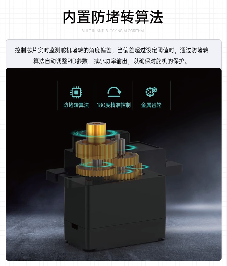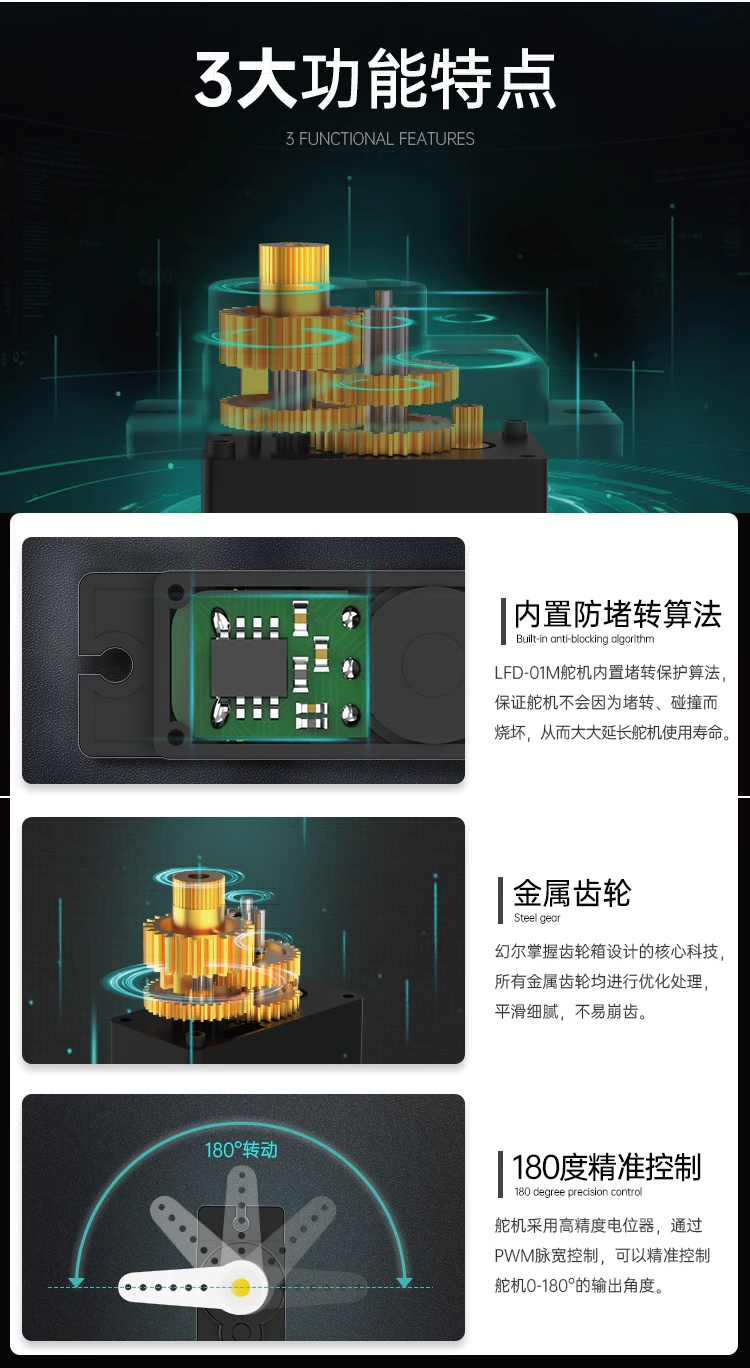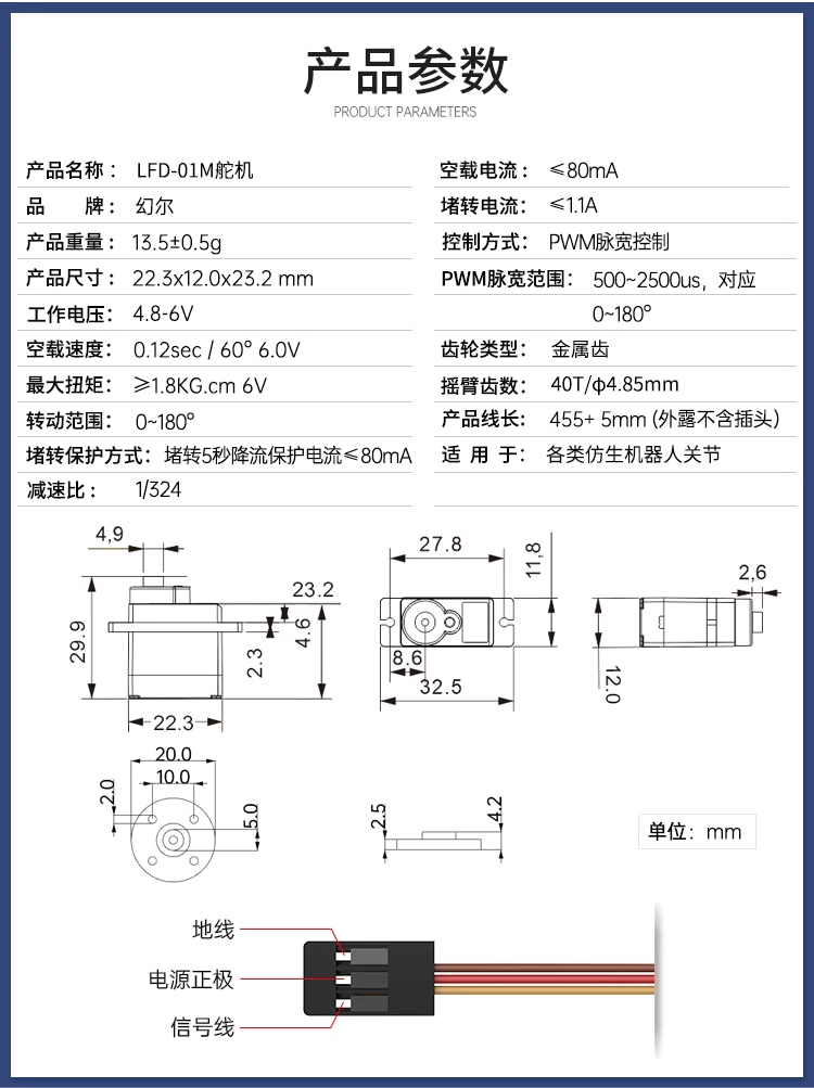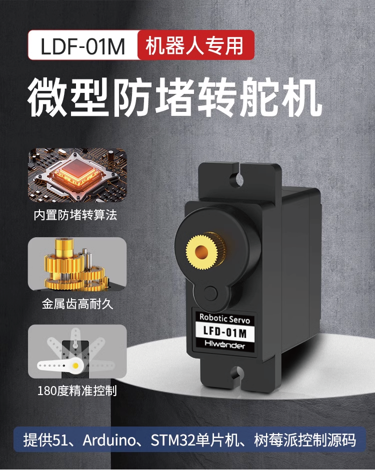 LFD-01M 金屬軸微型伺服器LFD-01M 伺服器內建阻塞保護演算法,伺服器不會因阻塞、碰撞而燒毀,延長伺服器的使用壽命;精密的齒輪組合,掌握齒輪箱設計的核心科技,使齒輪平滑細緻,不易崩齒。可應用於多種機器人。