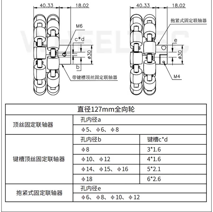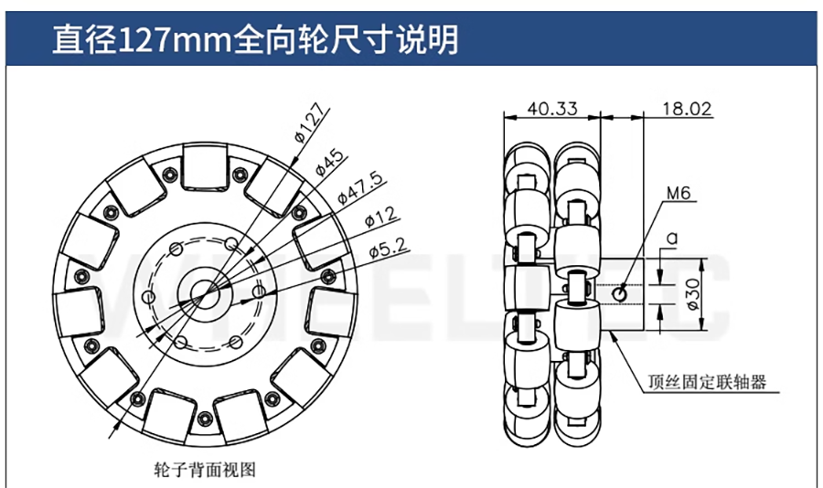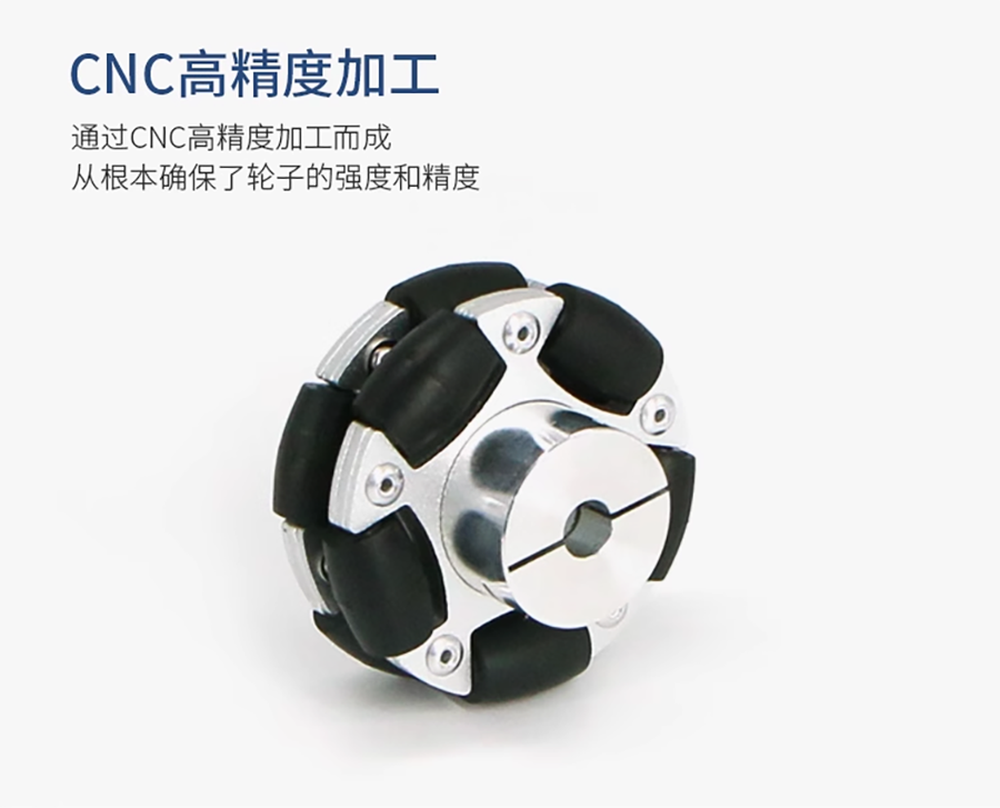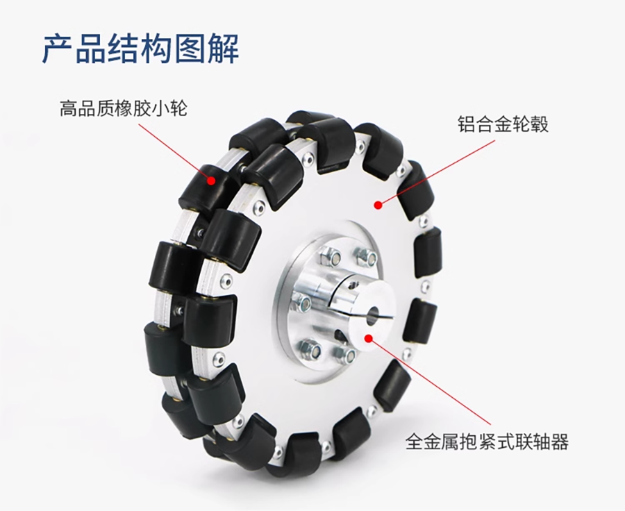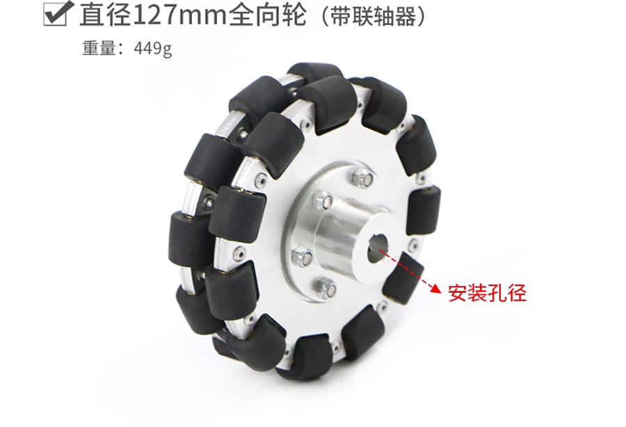 型號:127mm直徑重量(含聯軸器):449g支撐輪個數:11個單輪附載能力:40kg聯軸器內徑:18mm材質:鋁合金輪殼+高品質橡膠輪