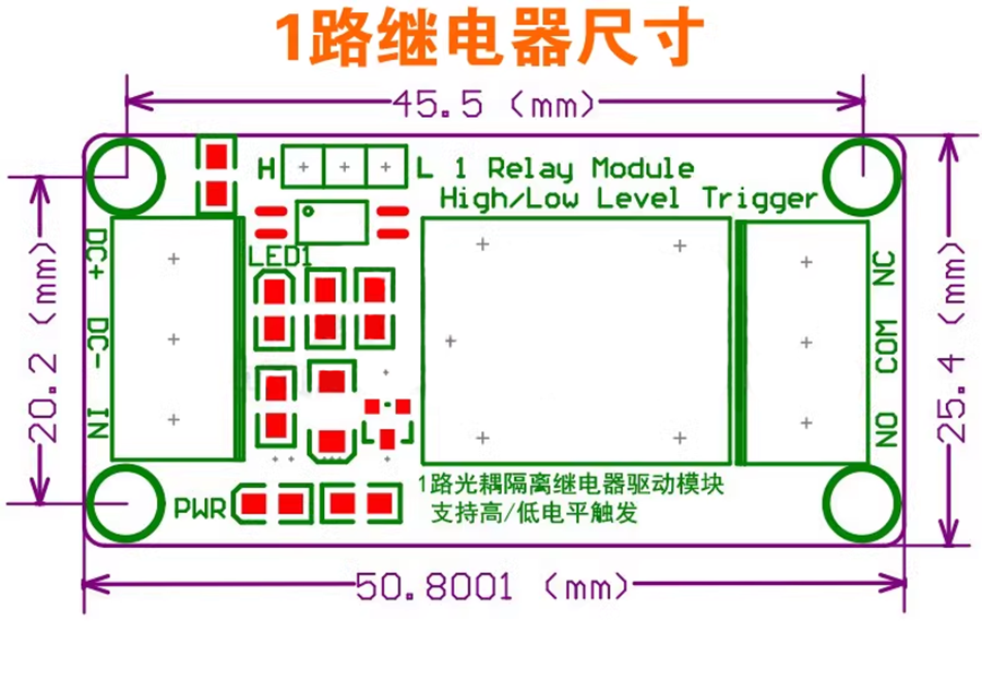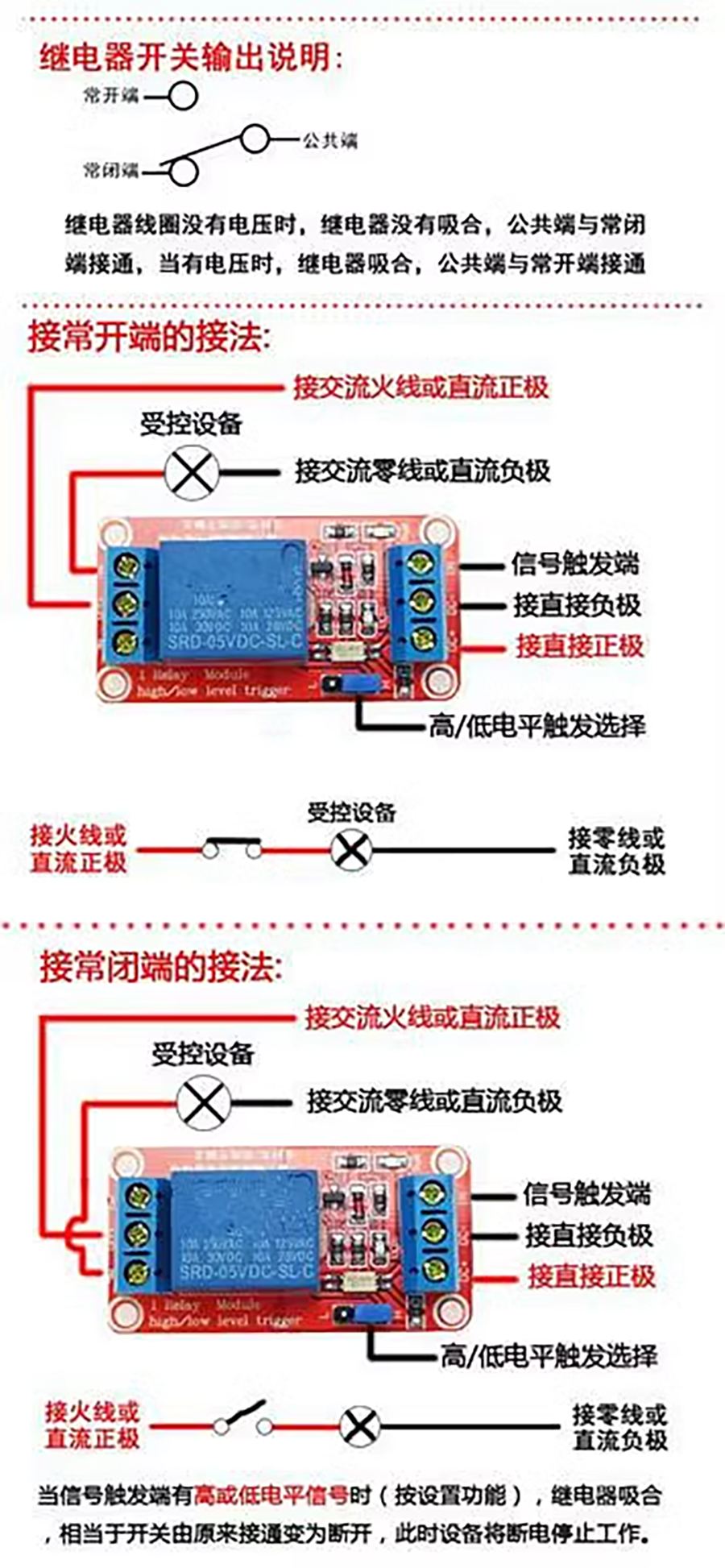 模組介面:1、DC+:接電源正極(電壓依繼電器需求)2、DC-:接電源負極3、IN:可高或低電平控制繼電器吸合繼電器輸出端:1、NO: 繼電器常開接口,繼電器吸合前懸空,吸合後與COM短接2、COM:繼電器公用介面3.NC: 繼電器常閉接口,繼電器吸合前與COM短接,吸合後懸空高低電平觸發選擇端:1.跳線與LOW短接時為低電平觸發;2.跳線與high短接時為高電平觸發。