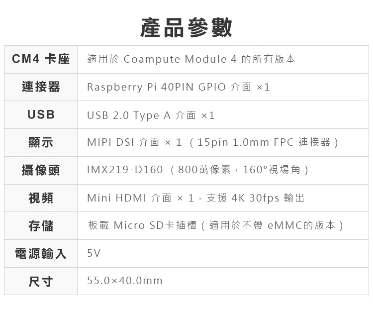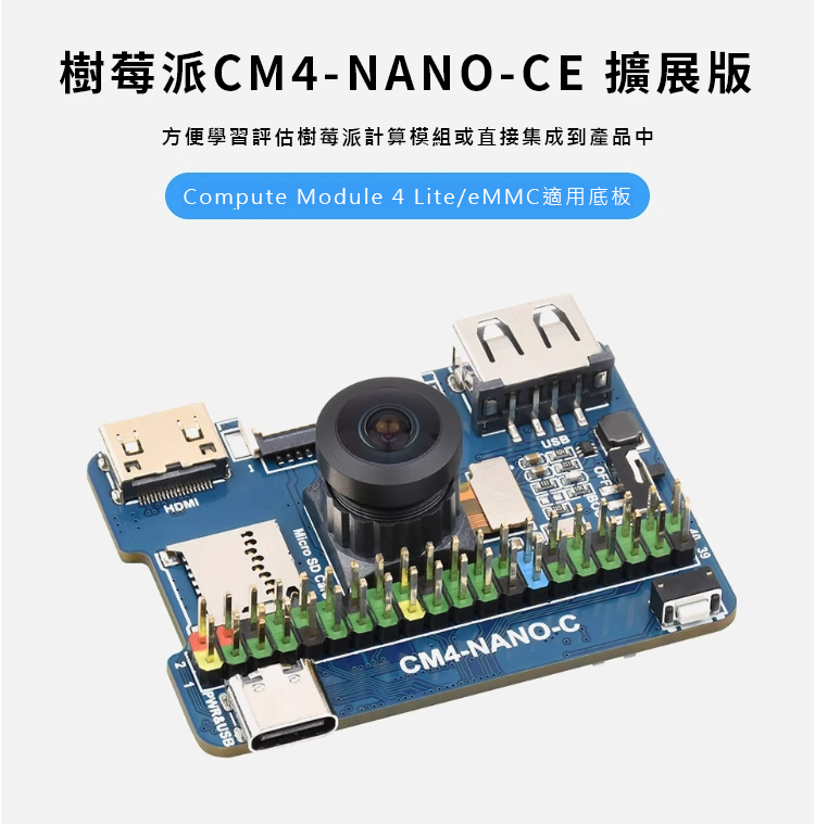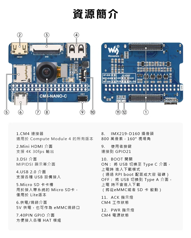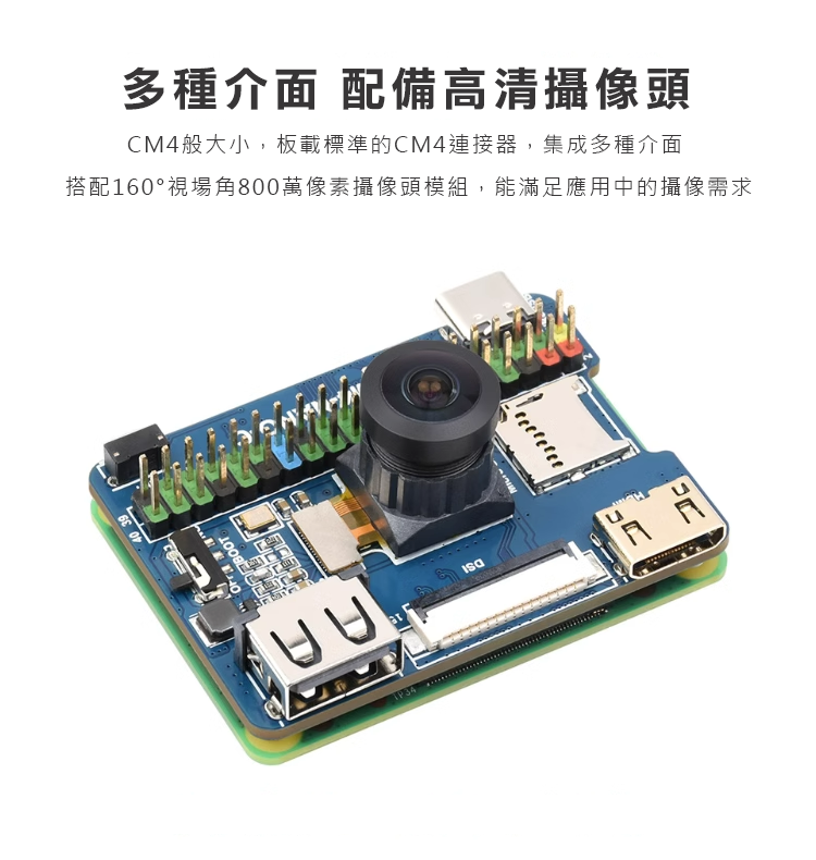 板載標準的CM4連接器,集成多種介面搭配160°視場角800萬像素攝像頭模組,能滿足應用中的攝像需求。