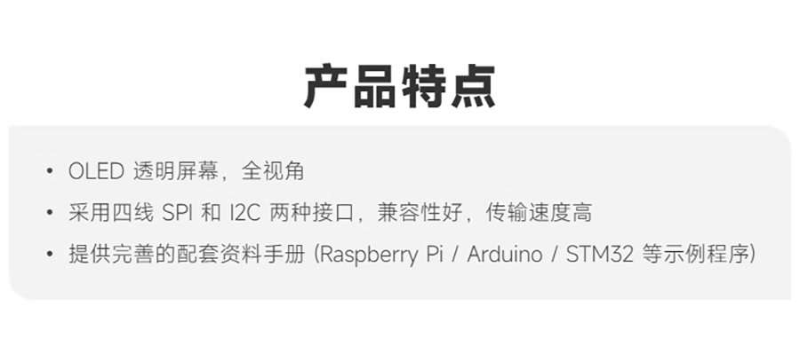 【產品特色】採用全視角透明OLED屏幕,提供清晰且鮮豔的顯示效果。支援SPI和I2C兩種接口,兼容性高,傳輸速度快,適用於樹莓派、Arduino、STM32等開發板。搭配完善的資料手冊和範例程式,讓開發者可以輕鬆上手不含主板,主板需另外購買