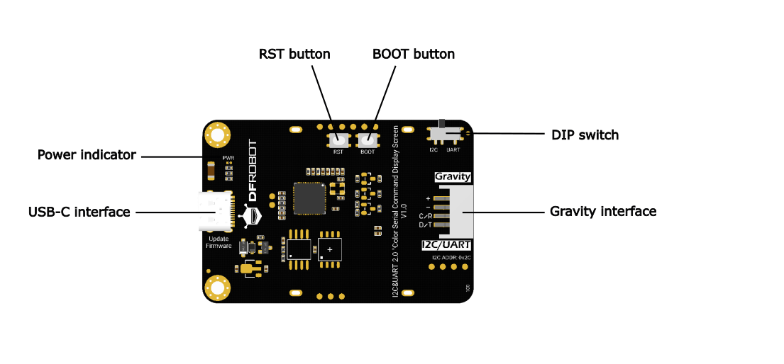 Basic Specifications● Power Supply Voltage: DC 3.3V~5V● Static Power Consumption: <70mA● Power Interface: PH2.0-4P Gravity interface● Communication Method: I2C/UART● Communication Interface: PH2.0-4P Gravity interface● USB Drive Interface: USB-C● USB Drive Space: 8MB● Dimensions: 62mm×42mm×10mm● Mounting Hole Diameter: 3.0mmDisplay Specifications● Size: 2.0 inches● Resolution: 320×240● Display Area: 40.8×30.6mm● Display Color: 16-bit color depth (RGB565)● Viewing Angle: 80/80/80/80● Brightness: 250cd/㎡