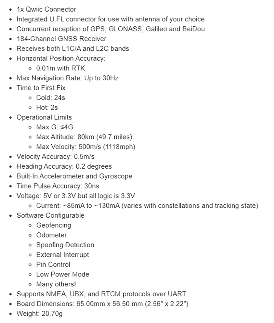 SparkFun ZED-F9R GPS pHAT 是一款高精度感測器融合 GPS 板,具有同樣令人印象深刻的配置選項,並利用 u-blox 的汽車航位推算 (ADR) 技術。 ZED-F9R 模組透過融合 3D IMU 感測器、車輪刻度、車輛動力學模型、校正資料和 GNSS 測量來提供高精度和連續的位置。ZED-F9R 模組是一款 184 通道 u-blox F9 引擎 GNSS 接收器,這意味著它可以接收來自 GPS、GLONASS、伽利略和北斗星座的訊號,精度約為 0.01 公尺!沒錯,當 RTK 導航解決方案與校正源一起使用時,可以實現這樣的精度。請注意,ZED-F9R 只能作為流動站運行,因此您需要連接到基地台。此模組支援四個GNSS系統的並發接收。ZED-F9R 上的 GNSS 和整合 3D 感測器測量相結合,可提供高達 30Hz 的準確、即時定位速率。與其他 GPS 模組相比,此 pHAT 最大限度地提高了密集城市或覆蓋區域的定位精度。即使在訊號條件較差的情況下,也可以在城市環境中提供連續定位,並且在訊號完全丟失時也可以使用(例如,短隧道和停車場)。ZED-F9R 是需要在挑戰性條件下精確定位的自主機器人應用的終極解決方案。該 u-blox 接收器支援一些串行協定。預設情況下,我們使用Raspberry Pi的串行UART與模組通訊。透過預先焊接接頭,無需焊接即可將 pHAT 堆疊在 Raspberry Pi、NVIDIA Jetson Nano、Google Coral 或任何 2x20 外形尺寸的單板電腦上。我們也從 u-blox 接收器上拆出了一些 0.1 英吋間距的接腳。基於 U-blox 的 GPS 產品可使用流行但密集的 Windows 程式 u-center 進行設定。ZED-F9R 上可以配置許多不同的功能:波特率、更新率、地理圍欄、欺騙偵測、外部中斷、SBAS/D-GPS 等。SparkFun ZED-F9R GPS pHAT 還具有板載可充電電池,可為 ZED-F9R 上的 RTC 供電。這減少了從冷啟動(約 24 秒)到熱啟動(約 2 秒)的首次修復時間。電池無需長時間連接電源即可保存 RTC 和 GNSS 軌道資料。