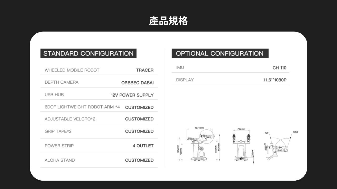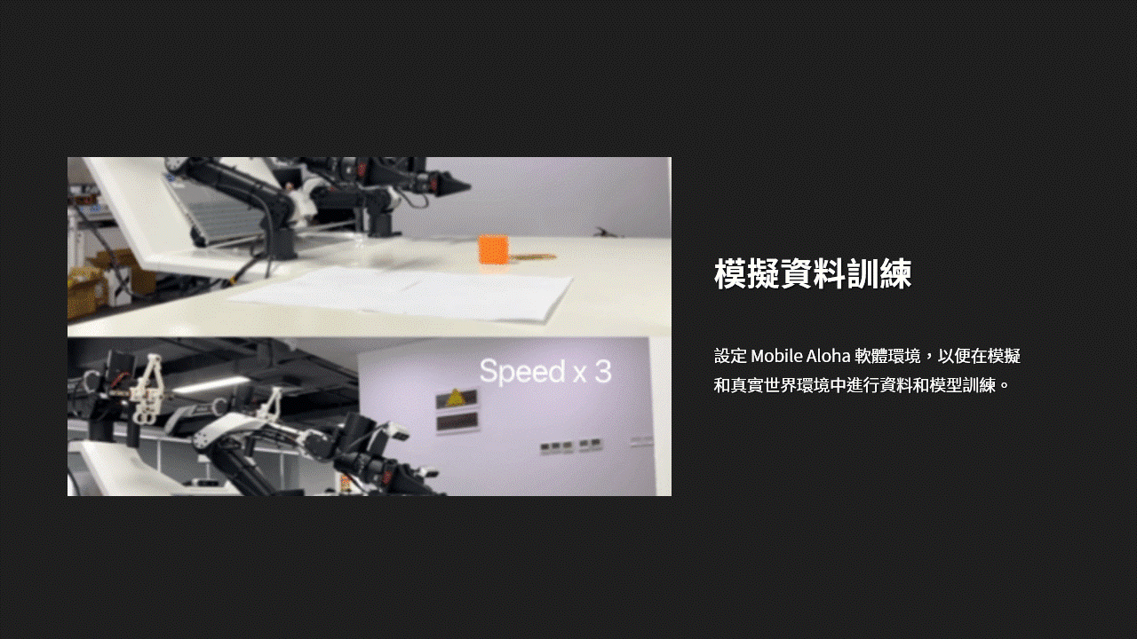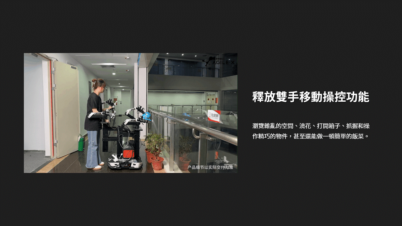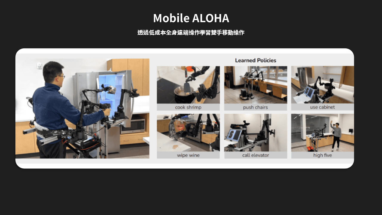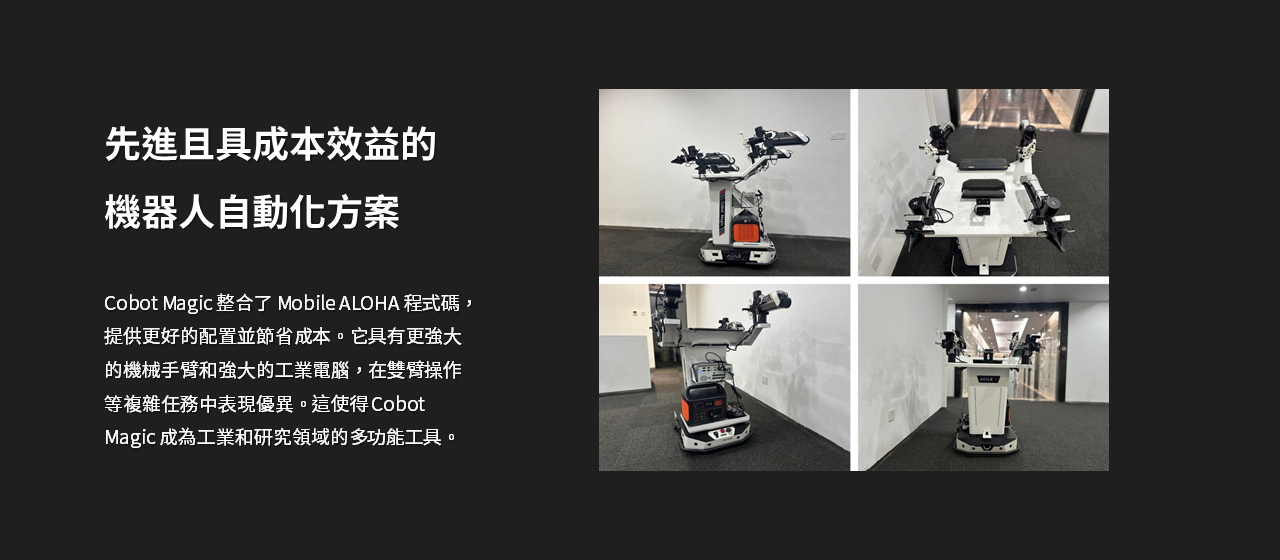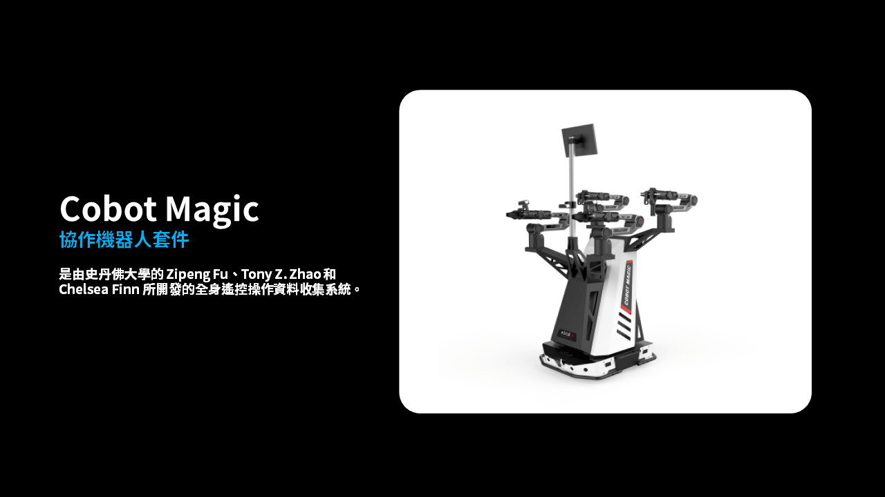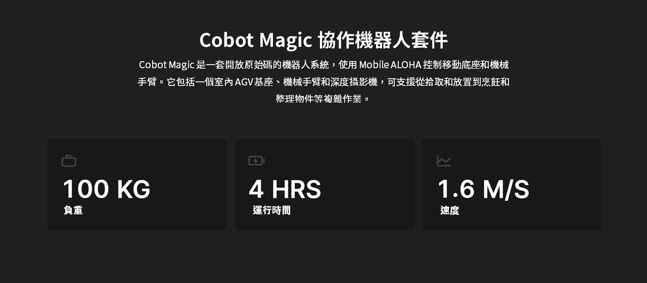 Cobot Magic 是一套開放原始碼的機器人系統,使用 Mobile ALOHA 控制移動底座和機械手臂。它包括室內 AGV 基座、機械手臂和深度攝影機,可支援從拾取和放置到烹飪和整理物件等複雜作業。