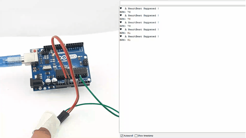感測器可以戴在手指或者夾在耳垂上,透過連接線與Arduino相連。它還有提供一個開源的App程式,可以即時地把您的心跳數值用圖線方式顯示出來。