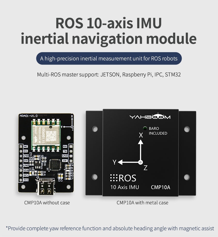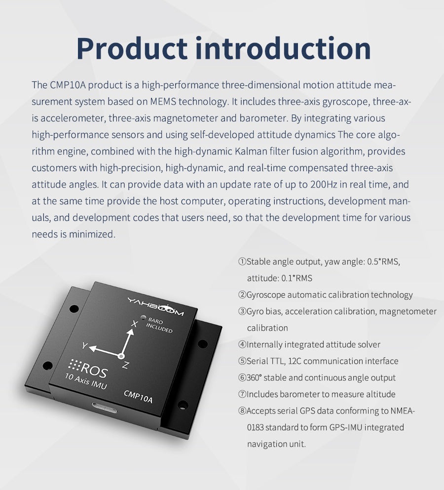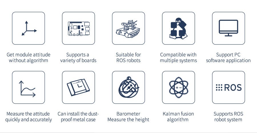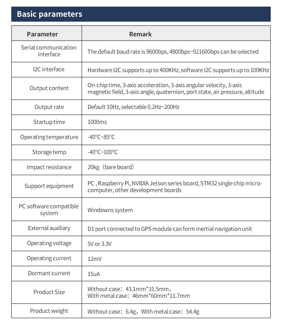 參數 備註 串口通訊 預設鮑率9600bps,可選4800bps至921600bps I2C接口 硬體I2C最高支援400KHz,軟體I2C最高支援100KHz 輸出內容 晶片時間、三軸加速度、三軸角速度、三軸磁場、三軸角度、四元數、端口狀態、氣壓、高度 輸出速率 預設10Hz,可選0.2Hz至200Hz 啟動時間 1000ms 工作溫度 -40°C至85°C 儲存溫度 -40°C至100°C 耐衝擊 20kg(裸板) 支援設備 個人電腦(PC)、樹莓派(Raspberry Pi)、NVIDIA Jetson系列主板、STM32單片機 電腦調適相容系統 Windows系統 外部輔助 可通過D1端口接入GPS模組以組成慣導單元 工作電壓 5V或3.3V 工作電流 12mA 休眠電流 15uA 產品尺寸 帶金屬外殼版本:46mm * 60mm * 11.7mm 產品重量 帶金屬外殼版本:54.4g ROS支援 ROS1/ROS2