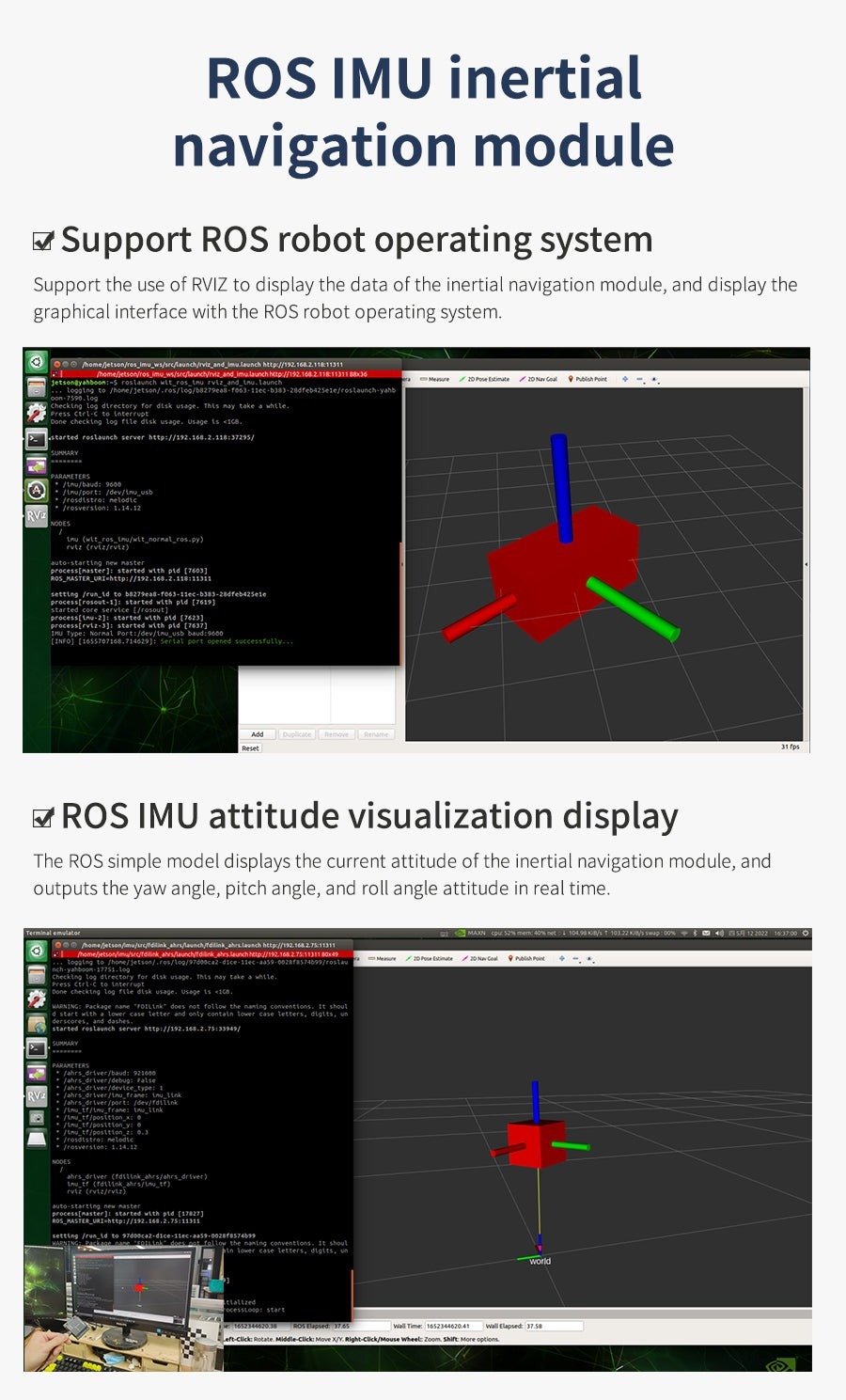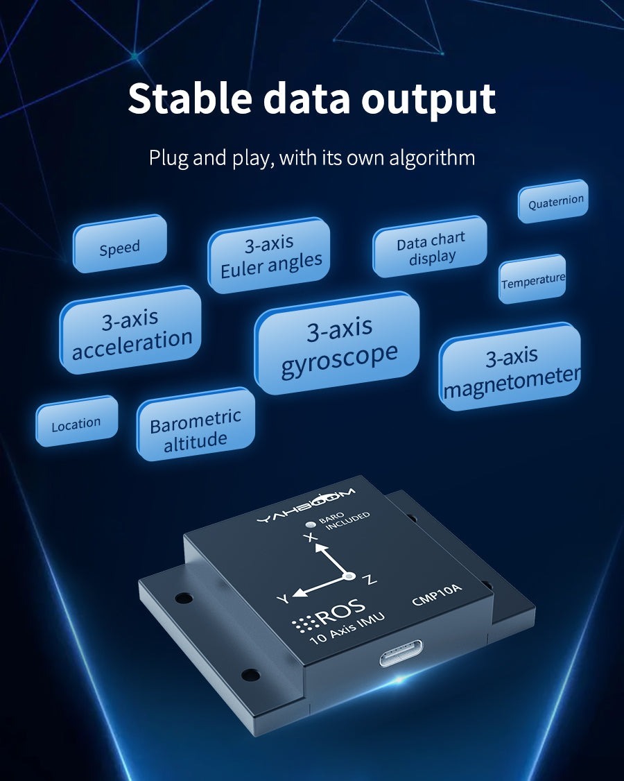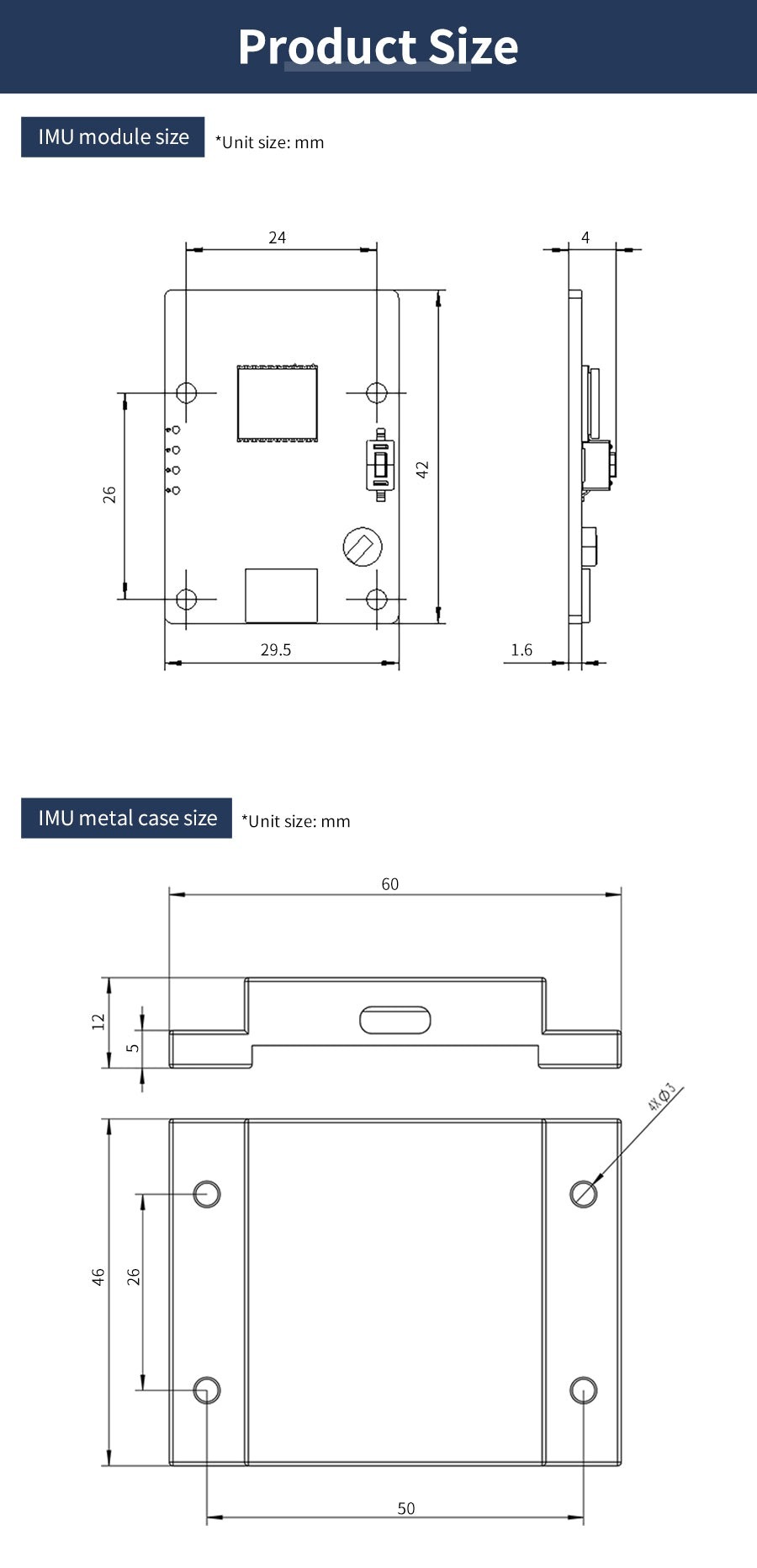 參數 備註 串口通訊 預設鮑率9600bps,可選4800bps至921600bps I2C接口 硬體I2C最高支援400KHz,軟體I2C最高支援100KHz 輸出內容 晶片時間、三軸加速度、三軸角速度、三軸磁場、三軸角度、四元數、端口狀態、氣壓、高度 輸出速率 預設10Hz,可選0.2Hz至200Hz 啟動時間 1000ms 工作溫度 -40°C至85°C 儲存溫度 -40°C至100°C 耐衝擊 20kg(裸板) 支援設備 個人電腦(PC)、樹莓派(Raspberry Pi)、NVIDIA Jetson系列主板、STM32單片機 電腦調適相容系統 Windows系統 外部輔助 可通過D1端口接入GPS模組以組成慣導單元 工作電壓 5V或3.3V 工作電流 12mA 休眠電流 15uA 產品尺寸 帶金屬外殼版本:46mm * 60mm * 11.7mm 產品重量 帶金屬外殼版本:54.4g ROS支援 ROS1/ROS2