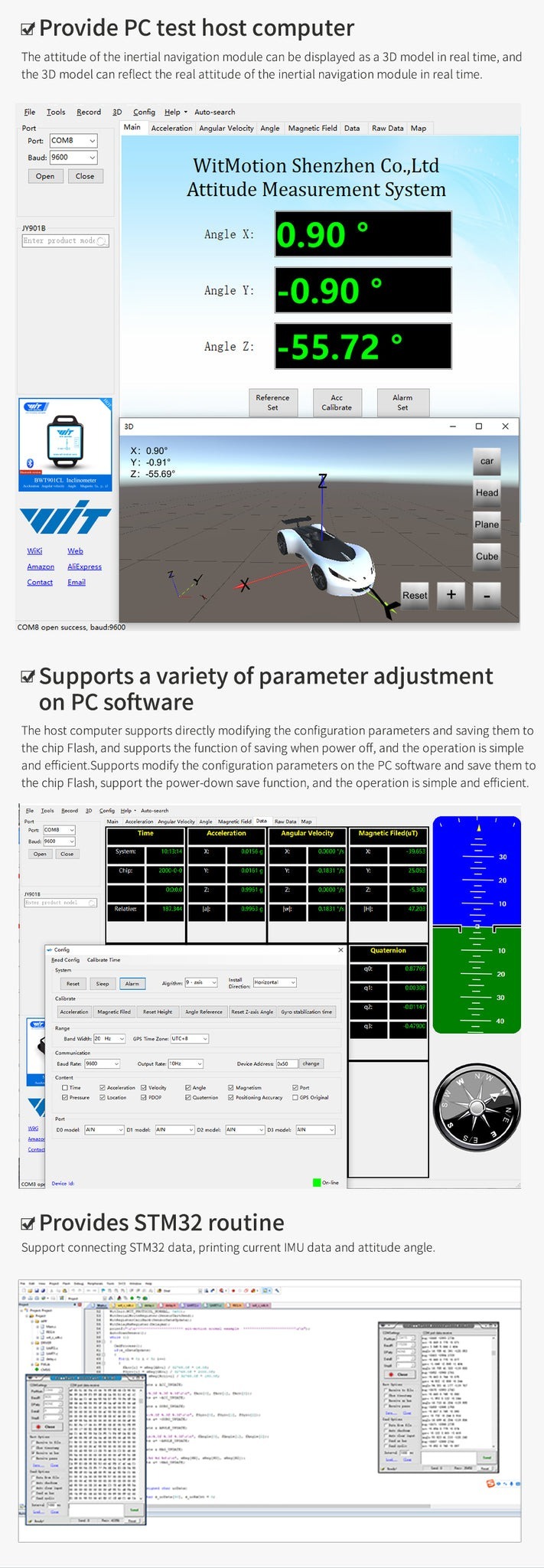 3.內建卡爾曼算法,可輸出歐拉角、四元數、位置、速度、加速度、角速度、磁場向量。