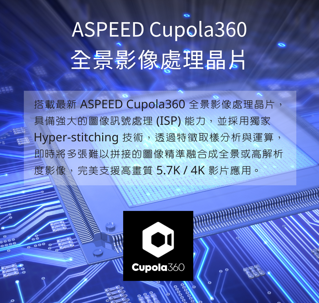 ● 搭載 ASPEED Cupola360 全景影像處理晶片,具備即時拼接技術,適用於5.7K/4K 影片,提供高畫質全景視覺體驗