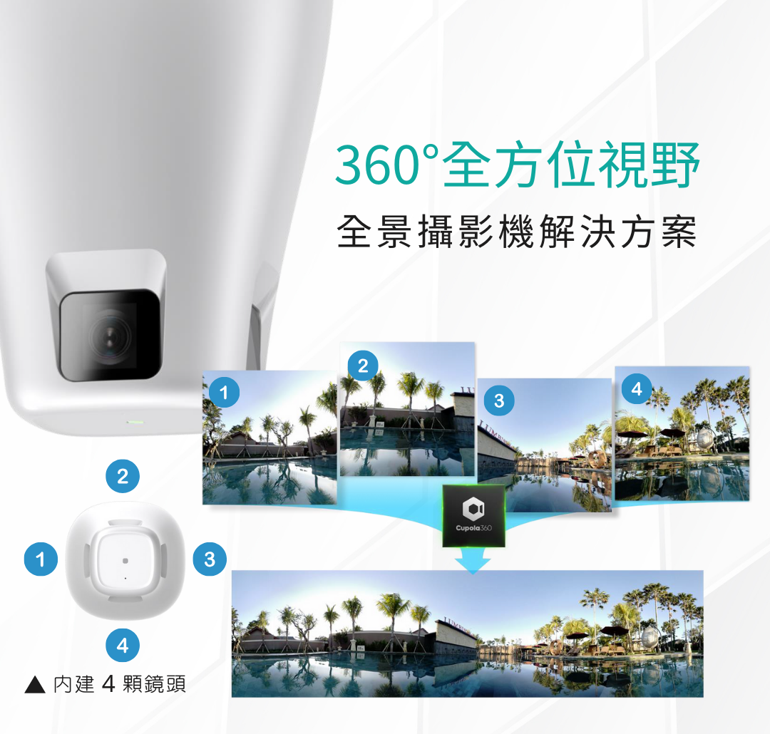 ● 內建 4 顆鏡頭,實現 360° 全方位視野 ,800萬像素