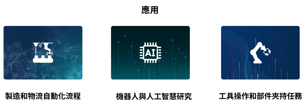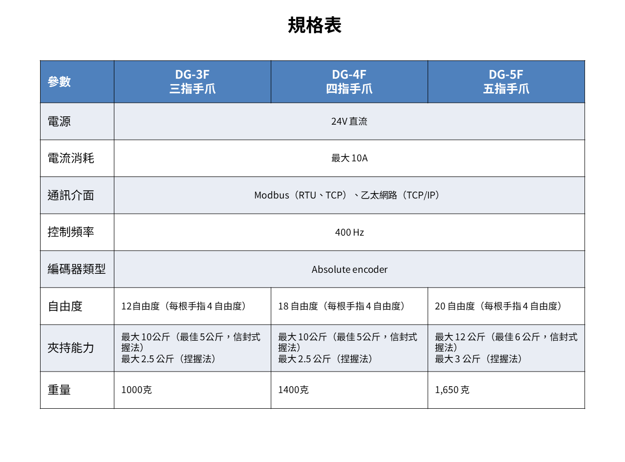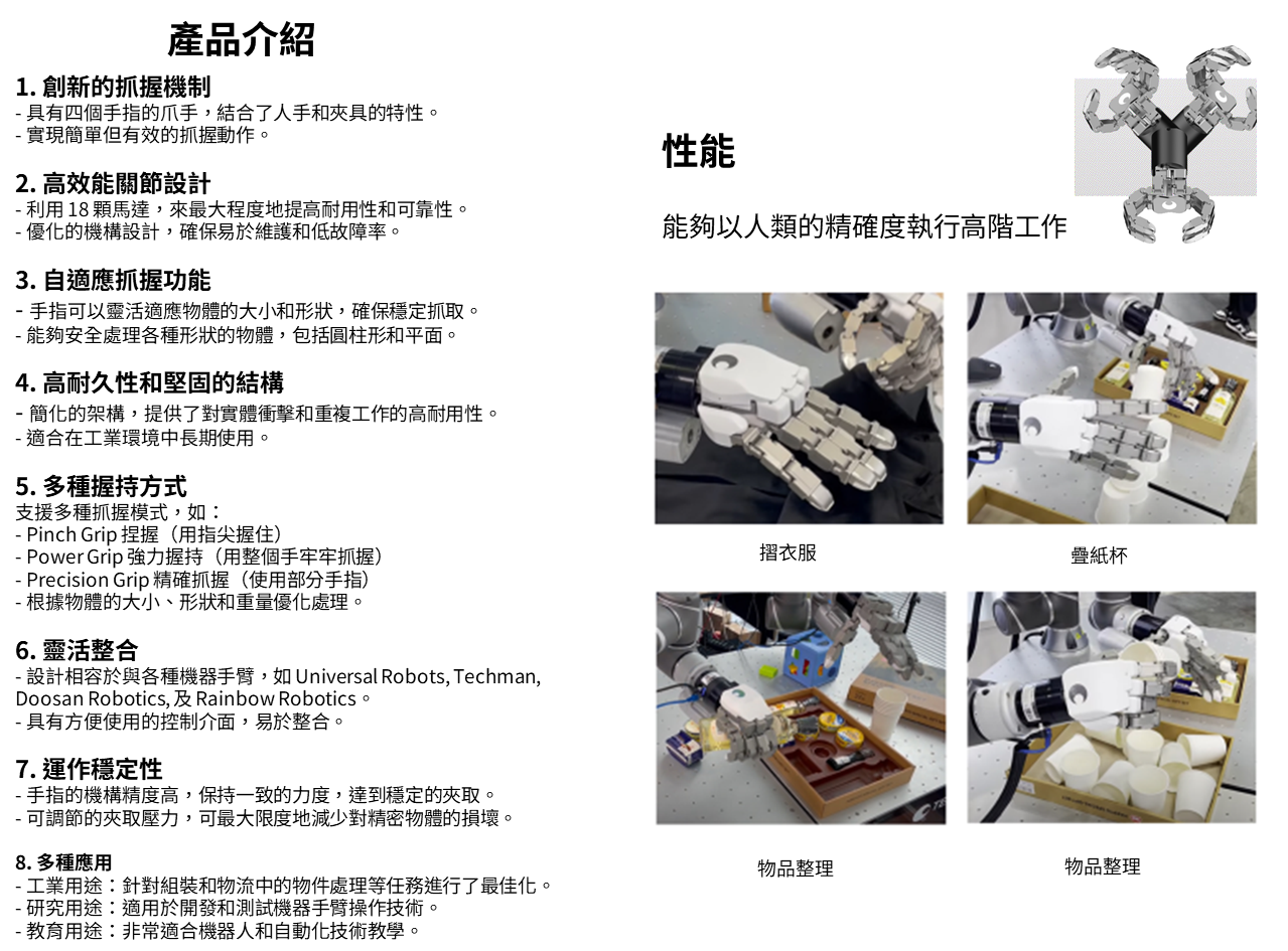 這款DG-4F 四指爪手,是融合了人手和抓握功能的爪手。這種多功能機構模型,具有外觀適應性,並將左手、右手和爪手的功能整合在一個產品中。相容 Universal Robots, Techman, Doosan Robotics, 及 Rainbow Robotics。