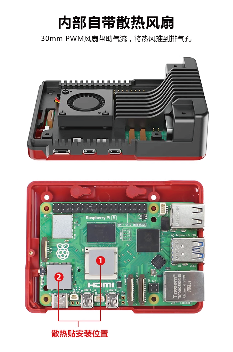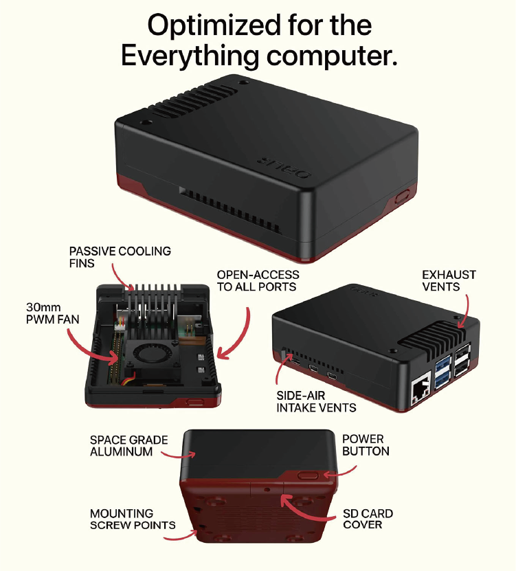 是專為滿足 Raspberry Pi 5 的高要求而重新設計。其被動式與主動式散熱的特色令人印象深刻。鋁製外殼上的被動散熱鰭片可充當散熱片,而進氣口可讓冷卻空氣進入機殼。此外,30 公釐 PWM 風扇有助於氣流,並將熱氣推出排氣口。