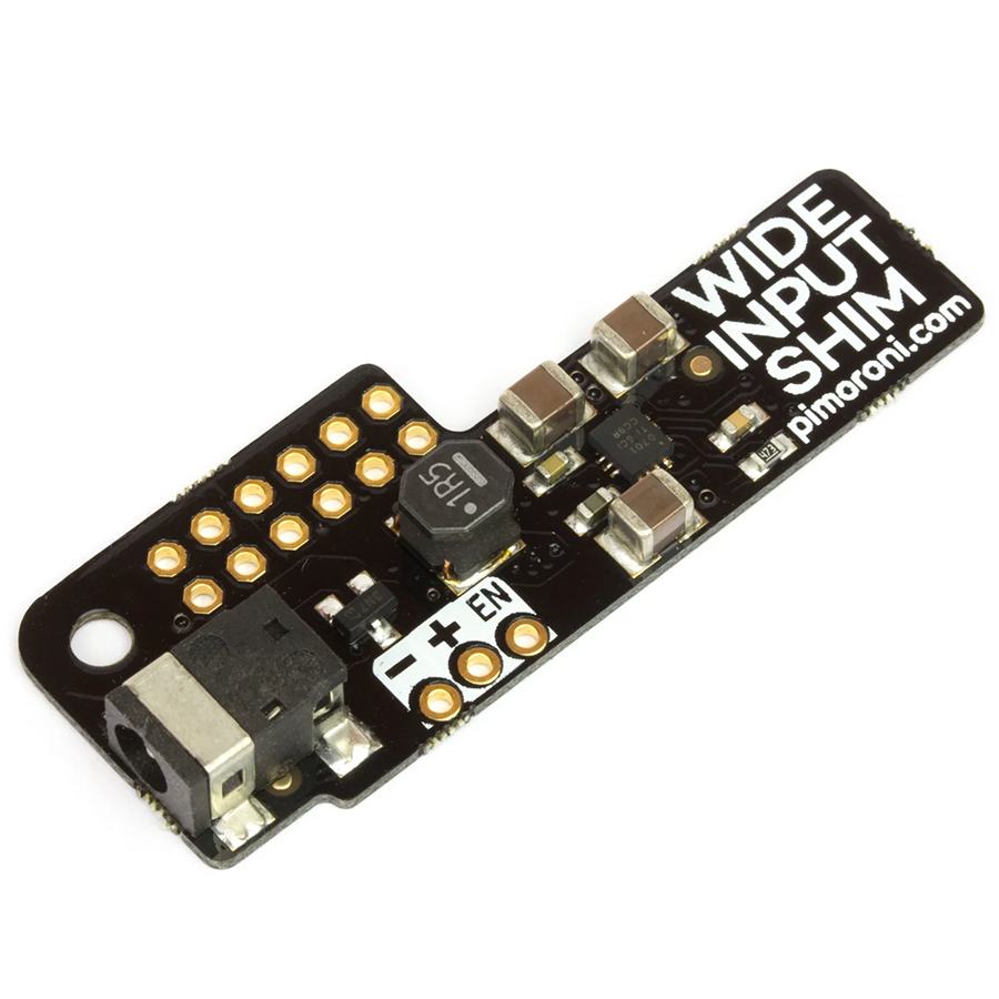 你可以透過DC電源擴充板的中心正極 3.5mm 外徑圓形插孔,或透過模組上標示出的 + 和 - 接腳,提供多種直流電壓輸入。該模組在5V至16V的輸入電壓範圍內,會提供5V/2A的輸出電壓(經由GPIO供應給樹莓派)。若輸入電壓降至4V時,電流將降至1.5A,而在3V時電流則降至1A。將 EN(使能)接腳拉低至接地會切斷5V輸出電壓,但請注意,在執行此操作前務必先正常關閉樹莓派,以避免損壞資料或系統。