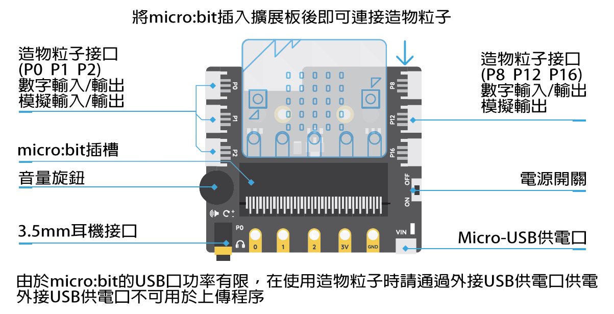 micro:bit 可以通過鱷魚夾來連接各種電子設備。因為其相容的元件種類眾多,連線極易造成斷路,短路,嚴重可導致micro:bit燒毀。為了方便程式設計愛好者輕鬆入門,我們為micro:bit設計了造物粒子擴展板,使其相容造物粒子模組。