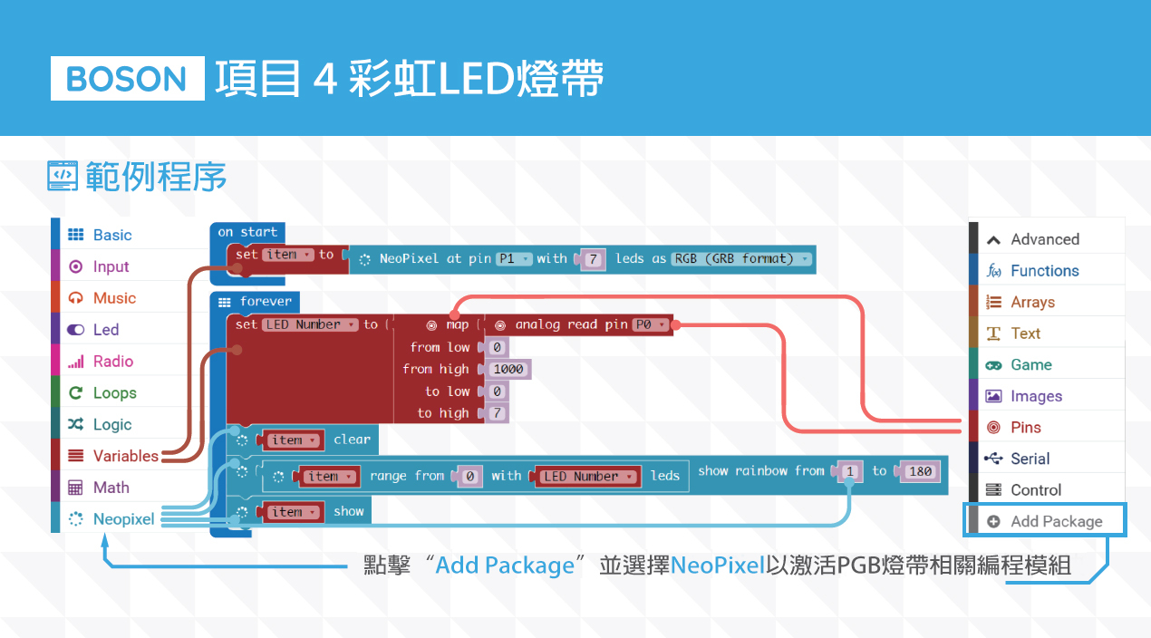 套件中包含了4張專案卡片,附帶連線圖與樣例代碼,開盒即可快速上手,樣例代碼也可用於後續的學習與參考。