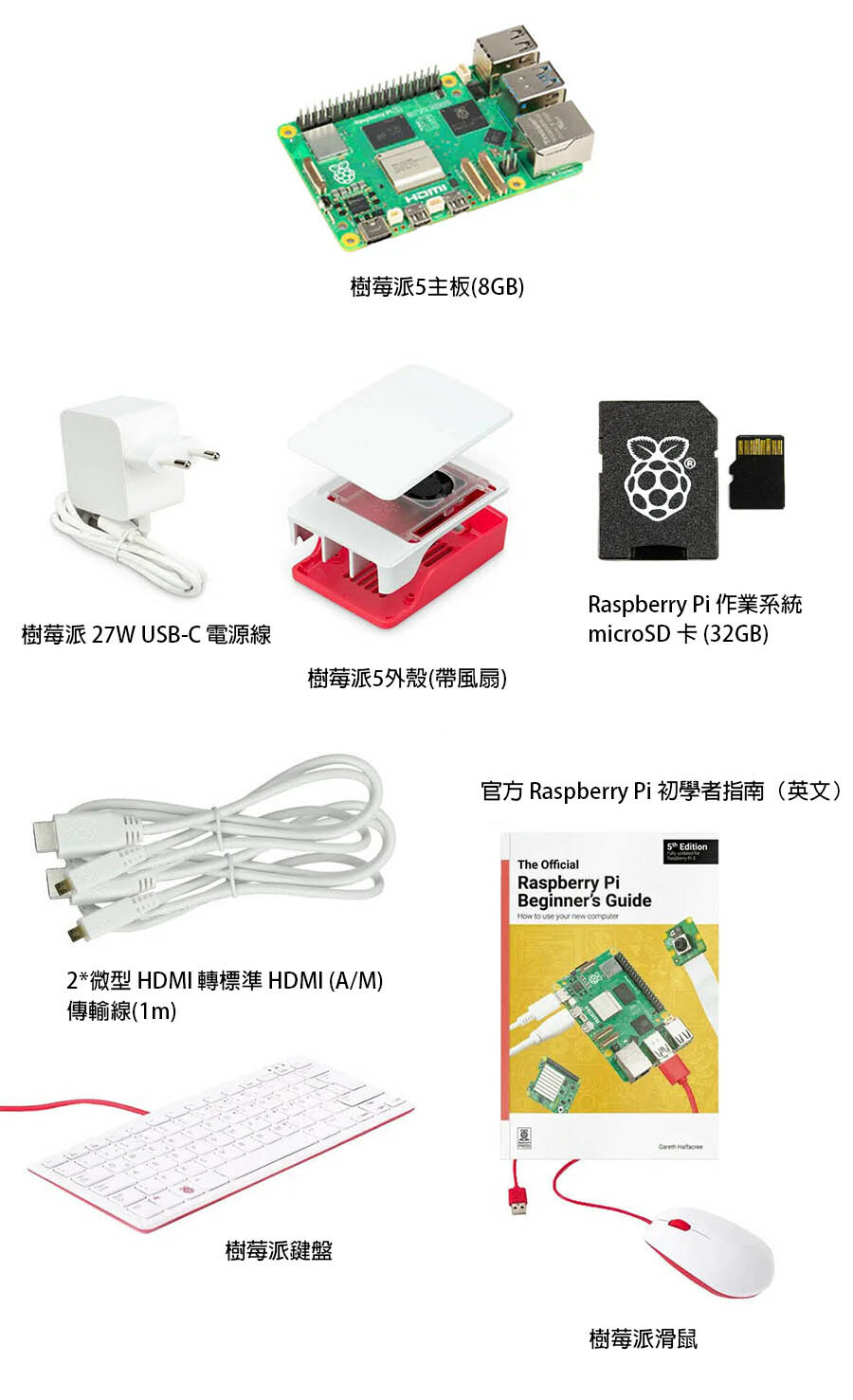 完整的桌上型電腦套件,包含開始使用 Raspberry Pi 5 所需的一切,只需添加一個(或兩個)HDMI顯示器即可。