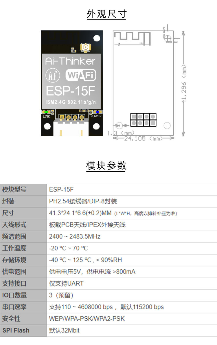 支援5V電源供電,無需考慮是否相容5V單晶片電平,採用PH2.54接線器/DIP-8封裝,集成 Wi-Fi MAC/BB/RF/PA/LNA,支援多種休眠模式,待機功耗低至1.0mW,串口速率最高可達4Mbps