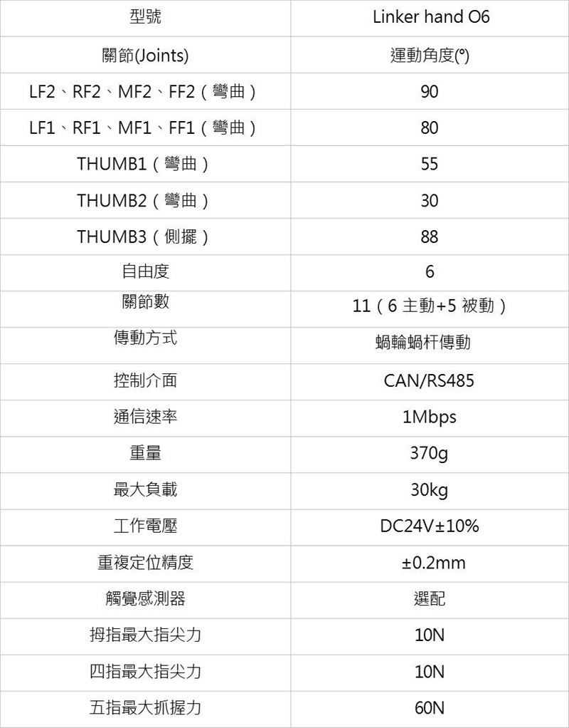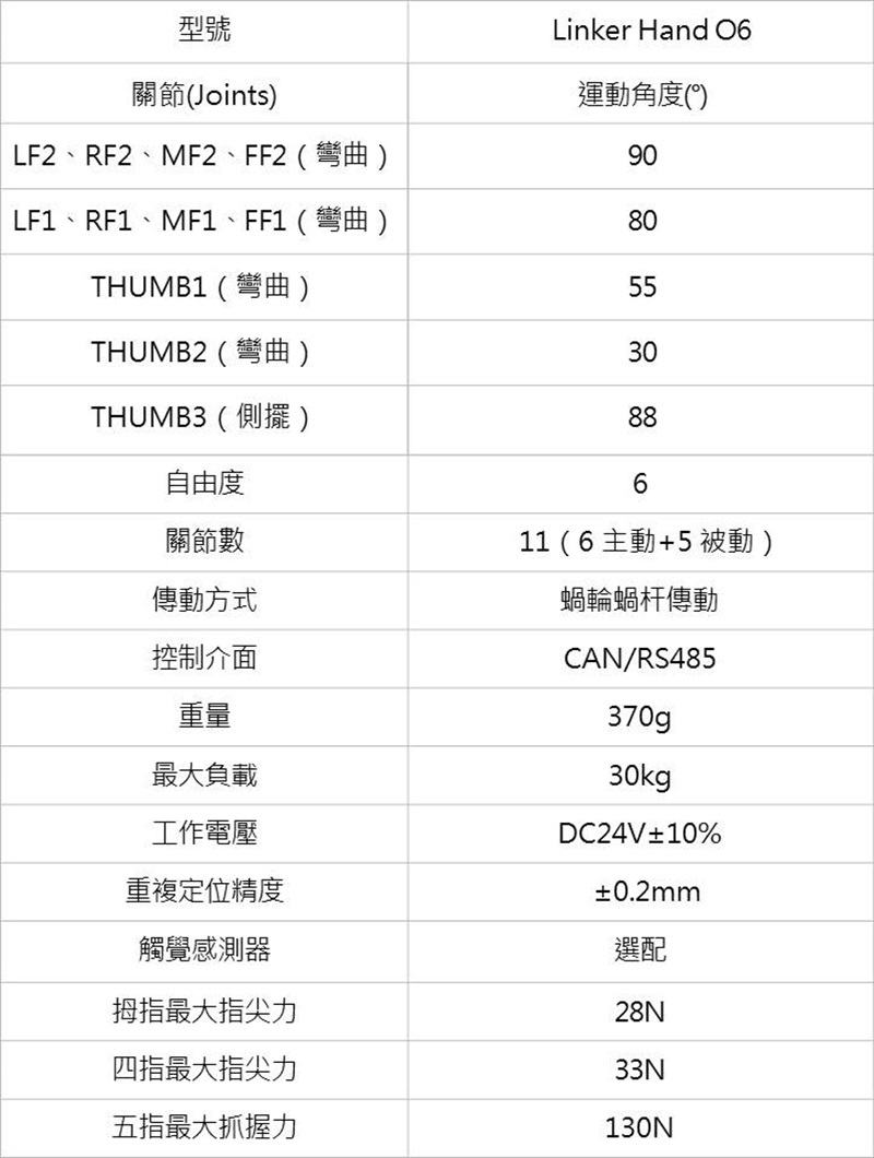 Linker Hand O6是一款6 個主動關節+5 被動關節,具有抓握力大,高精度力控能力,尺寸小、重量輕的特點,更適用於物流搬運、工業裝配、異形抓取等場景。