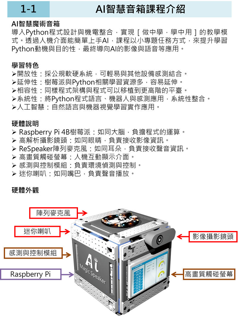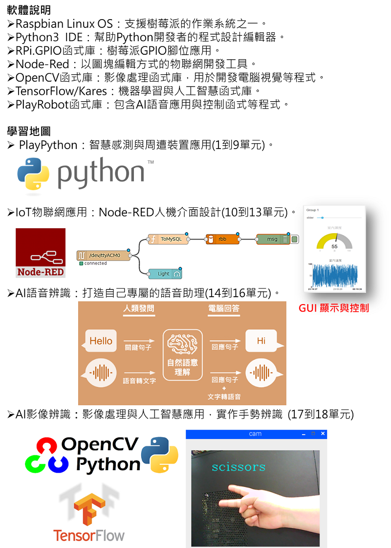 特色教學:python程式+Arduino應用、AI + IoT無所不控 學習歷程:IoT實務認證、AI + IoT專題、創客、競賽最佳利器 學習重點:從玩python開始,再到手機端控制,最後到AI時代語音及影像控制 |