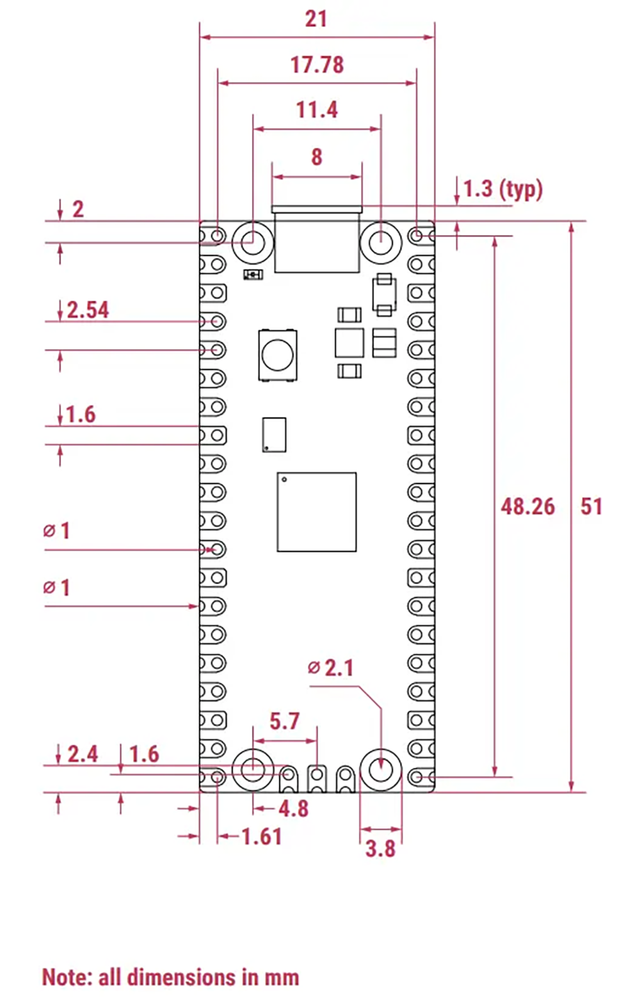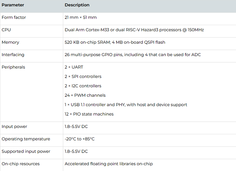 ● 高效能晶片:高效能RP2350微控制器,時脈速度高達150MHz● 雙倍記憶體:板載 SRAM 容量加倍,達到 520KB● 雙倍儲存:板載快閃記憶體容量加倍,達到 4MB● 雙核心架構:選擇更強大的 Arm Cortex-M33 內核或開源 RISC-V Hazard3 內核● 增強安全性:全面的安全架構,支援安全啟動、硬體加密等● 易於開發:支援C/C++和Python編程,降低開發門檻● 向後相容:硬體和軟體與 Raspberry Pi Pico 1 相容