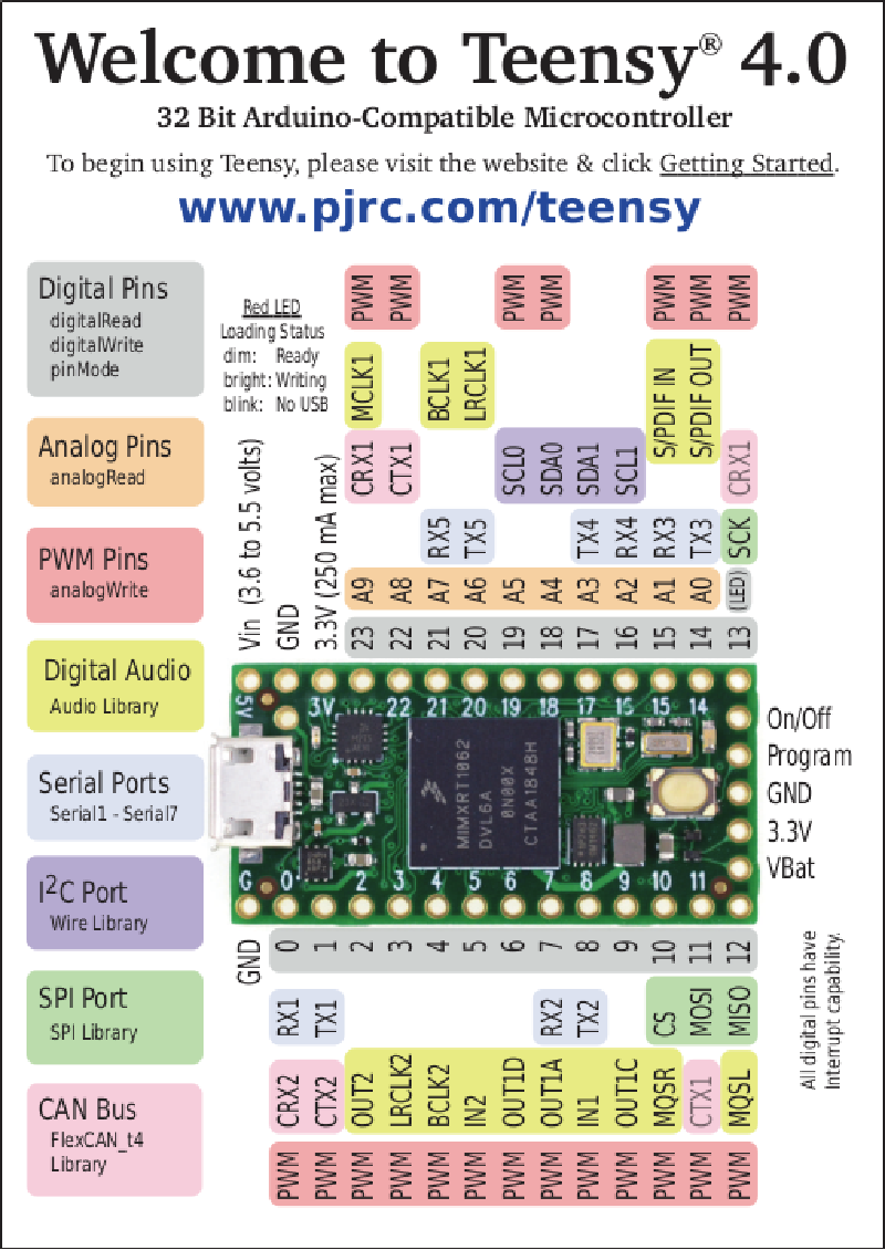 ● ARM Cortex-M7 at 600MHz● 1024K RAM (512K is tightly coupled)● 2048K Flash (64K reserved for recovery & EEPROM emulation)● 2 USB ports, both 480MBit/sec● 3 CAN Bus (1 with CAN FD)● 2 I2S Digital Audio● 1 S/PDIF Digital Audio● 1 SDIO (4 bit) native SD● 3 SPI, all with 16 word FIFO● 3 I2C, all with 4 byte FIFO● 7 Serial, all with 4 byte FIFO● 32 general purpose DMA channels● 31 PWM pins● 40 digital pins, all interrrupt capable● 14 analog pins, 2 ADCs on chip● Cryptographic Acceleration● Random Number Generator● RTC for date/time● Programmable FlexIO● Pixel Processing Pipeline● Peripheral cross triggering● Power On/Off management● Pre-soldered Male Headers