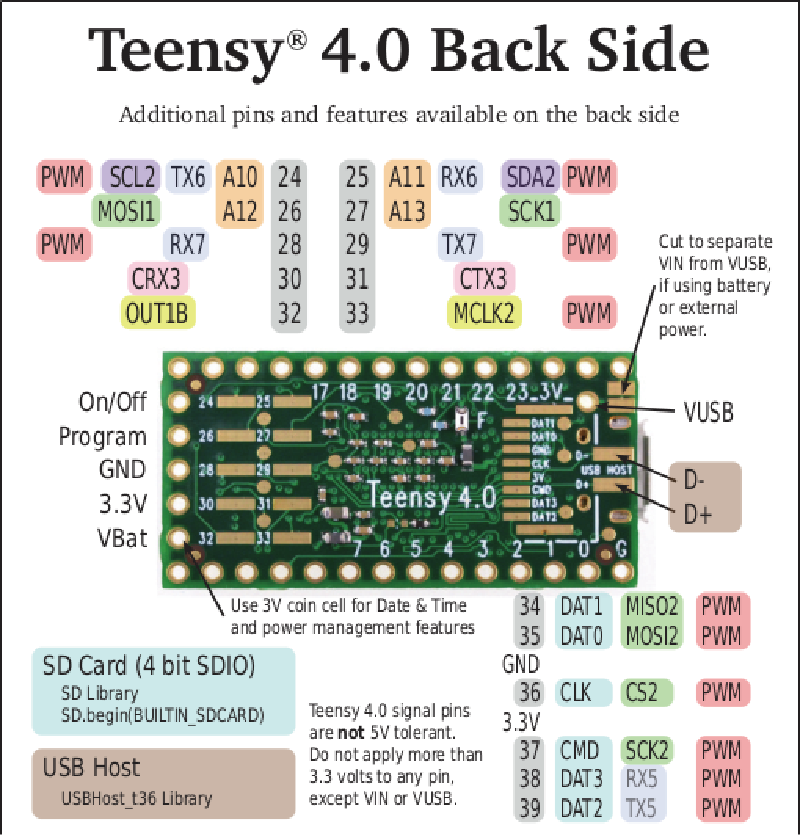 Teensy 4.0 的大小和形狀與 Teensy 3.2 相同,並保留與 Teensy 3.2 上大部分引腳功能的相容性。