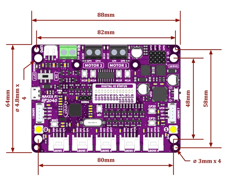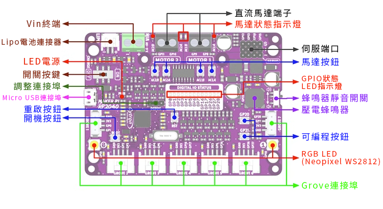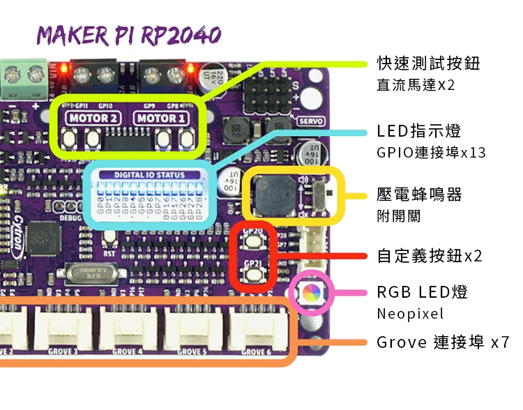 該板與現有的 Pico 生態系統相容,為 Pico 開發的軟體、硬體、資料庫也應與 Cytron Maker Pi RP2040 相容。