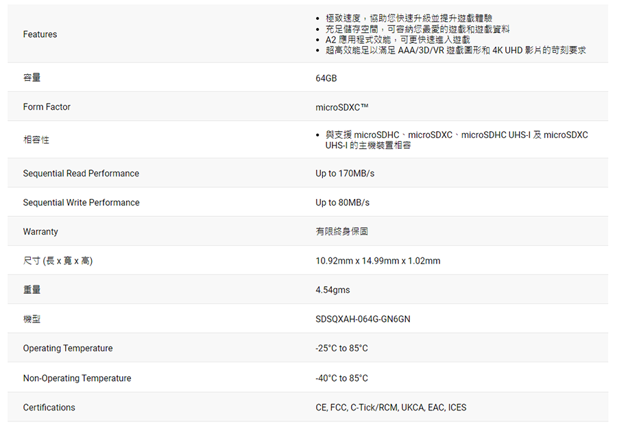 享受極速傳輸速度、應用程式效能和 4K UHD 影片。這款高效能 microSD 記憶卡適用於 Android™ 智慧型手機、運動攝影機或空拍機,可用於錄製 4K UHD 影片、Full HD 影片和高解析度相片。這款超快的 SanDisk Extreme® microSDXC™ 記憶卡讀取速度高達 170MB/s 且寫入速度高達 80MB/s。 此外,其為 A2 等級,因此,您可取得快速應用程式效能,以享受卓越的智慧型手機體驗。傳輸內容節省時間高達 170MB/s的快速讀取速度可讓您在不到 3 分鐘的時間內,傳輸 1000 張高解析度相片和 30 分鐘的 4K 影片 (24GB)。寫入速度最高可達 80MB/s以高達 80MB/s的寫入速度拍攝快速動作相片或拍攝 4K UHD 影片。SanDisk Extreme® microSDXC™ UHS-I 記憶卡可讓您拍攝更多內容且速度更快。適用於拍攝 4K UHD 影片不管是戶外活動、週末旅行或運動競賽,都可完美收錄,萬無一失。容量高達 1TB的 SanDisk Extreme® microSD™ UHS-I 記憶卡具有 UHS 速度等級 3 (U3) 和影片速度等級 30 (V30) 效能,能讓您連續拍攝 4K UHD 和 Full HD 影片A2 讓您更快載入應用程式得益於 SanDisk Extreme® microSD 記憶卡 A2 規格,能夠實現更快的應用程式效能,享受傑出的智慧型手機體驗適用於極限環境的耐用設計SanDisk Extreme® microSDHC™ 與 microSDXC™ UHS-I 記憶卡具有防震、耐高溫抗極寒、防水且抗 X 光等特色,讓您無需擔心記憶卡的耐用度,可以放心去冒險