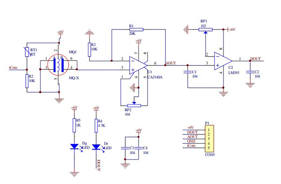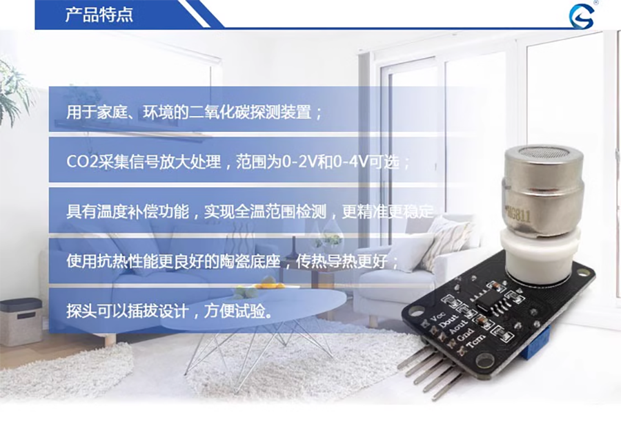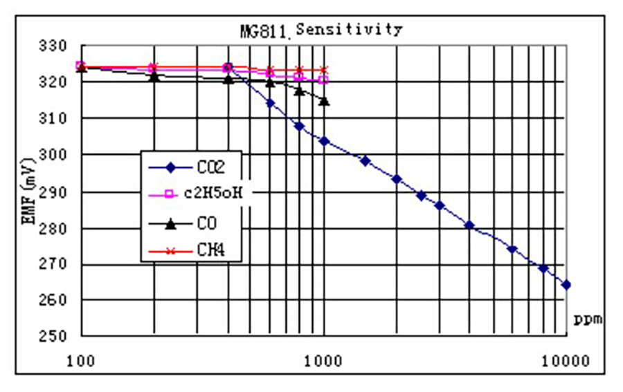 偵測原理:MG-811是採用固態電解質電池原理來檢測CO2的半導體氧化物化學感測器。當感測器保持在一定的工作溫度,置於 CO2 氣體中時,電池正負極發生電極反應,感測器敏感電極和參考電極之間產生電動勢,CO2濃度越高,輸出的電壓值就越小,成反比例線性關係,透過測試訊號電壓的變化,可偵測到 CO2濃度的變化。