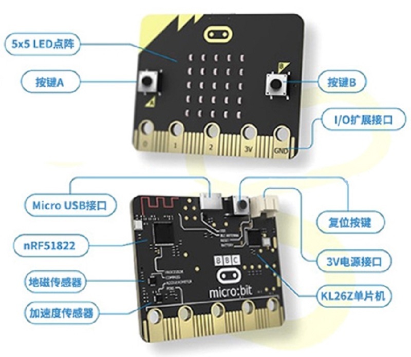 採用了基於ARM Cortex-M0的nRF51822處理器,集成藍牙功能,板載5×5 LED點陣、兩個可編程按鍵、加速度計、三軸地磁和溫度計等資源。