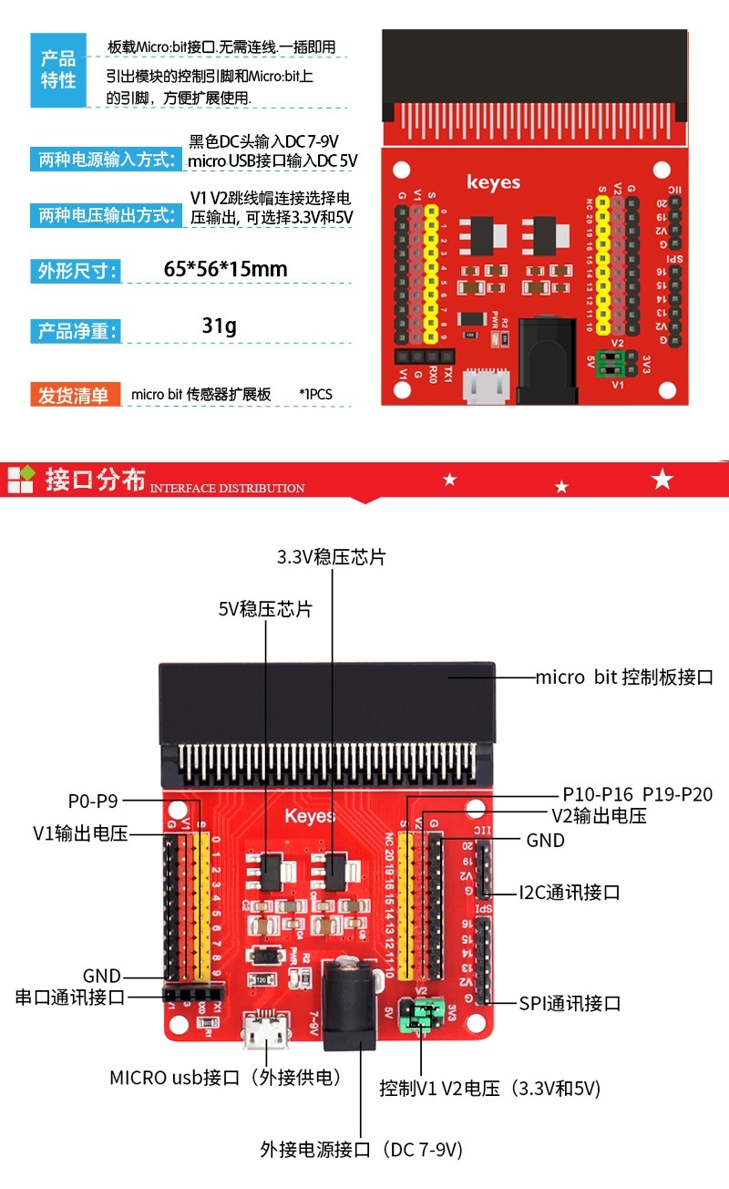 為了方便micro:bit開發板和其他感測器、模組接線,我們特別設計了這款擴展板。擴展板上內建了一個電源模組可以直接對micro:bit供電,也可以增加板的帶負載能力。