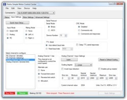 | Control interface: | USB; non-inverted TTL serial; RC servo pulses; analog voltage1 |