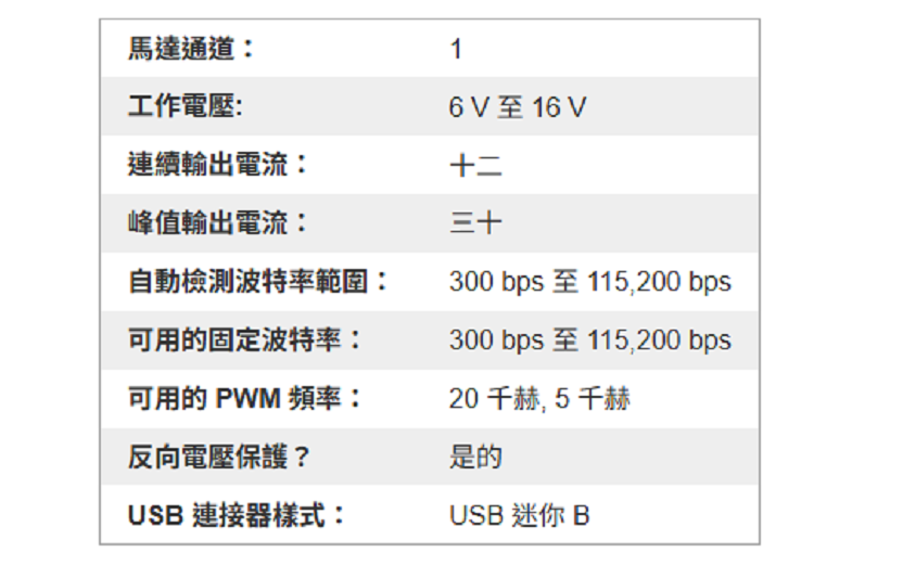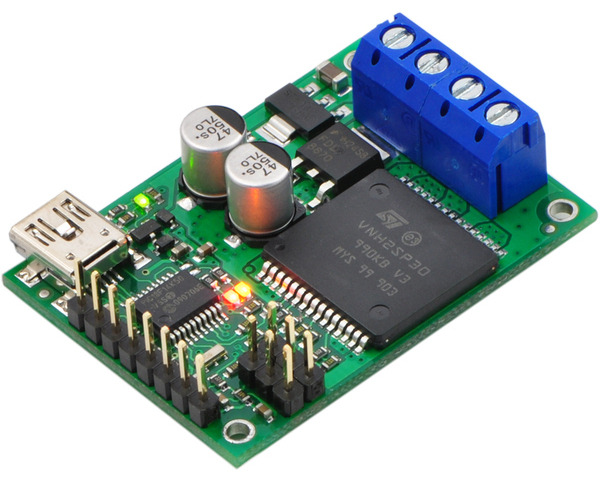 強大的 Jrk 12v12 馬達控制器是一種高度可配置的有刷直流馬達控制器,支援四種介面模式:USB、邏輯級串行、類比電壓和業餘無線電控制 (RC)。此控制器可用作開環速度控製或閉環速度或位置控制。連續輸出電流約 12 A(最大 30 A),工作範圍為 6 V 至 16 V(瞬態保護高達 40 V)。
