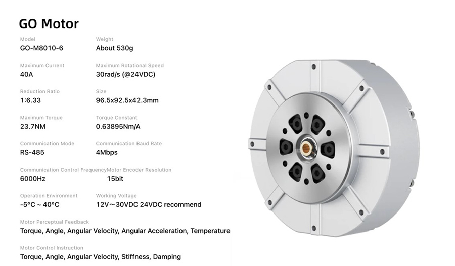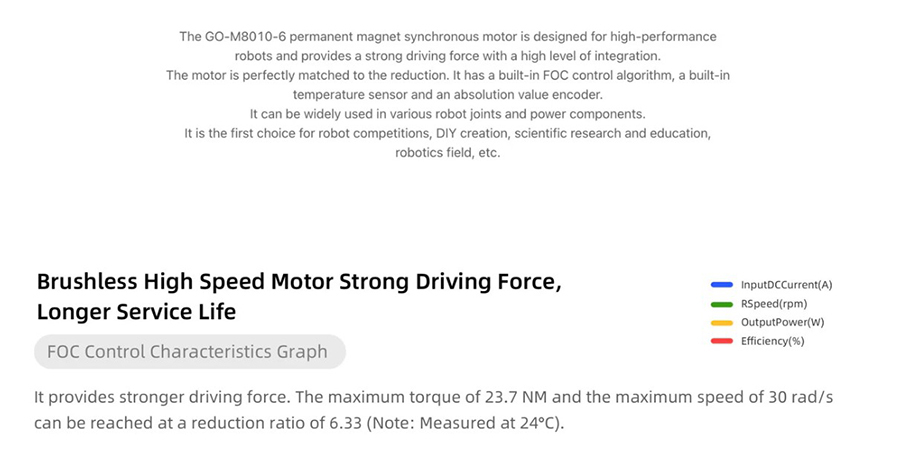 【產品特色】GO-M8010-6 Motor(仿生關節馬達)專為高性能機器人設計,提供強大的驅動力,且具有高度整合性。此馬達與減速機完美匹配,內建FOC控制算法、溫度感測器及絕對值編碼器。它是機器人大賽、DIY創作、科學研究與教育、機器人領域等的首選。