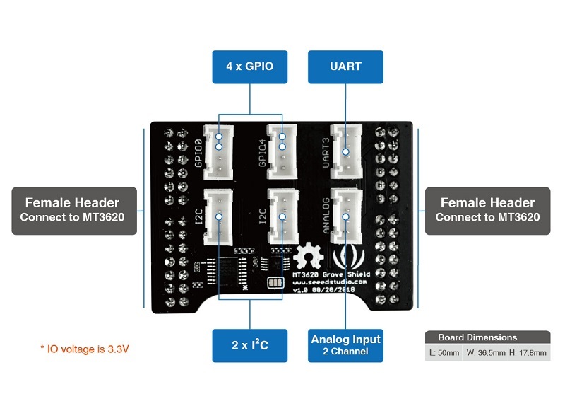 Azure Sphere MT3620開發套件帶有四個2.54mm接頭,用於MT3620的硬體資源擴展。MT3620 Grove Shield使用戶能夠快速應用傳感器模組-MT3620開發套件上的Seeedstudio Groves。